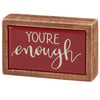 A small wooden box sign from our Valentine's Day Collection displaying a unique hand illustrated sentiment on dark red background that reads "You're Enough." Seasonal mini box sign features a natural wood frame and faux enamel finish behind design for a tile-like appearance. Our You're Enough box sign mini is easy to hang or can free-stand alone. A love-themed everyday home accent that can easily blend into any display.