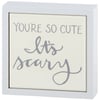 A small wooden box sign from our Haunted White Collection displaying a fun seasonal sentiment in a hand illustrated style on bone white background that reads "You're So Cute It's Scary." Fun Halloween sign features a coordinating white color frame and faux enamel finish behind design for a tile-like appearance. Our You're So Cute It's Scary sign is easy to hang or can free-stand alone. A fun Halloween home accent that can easily blend into any seasonal display.