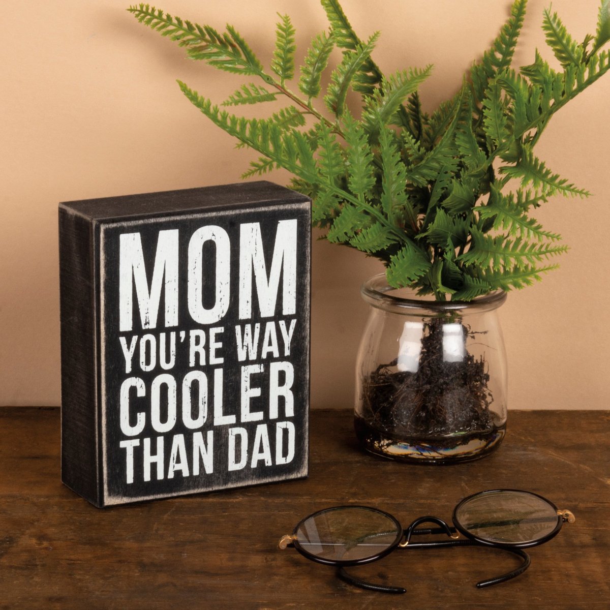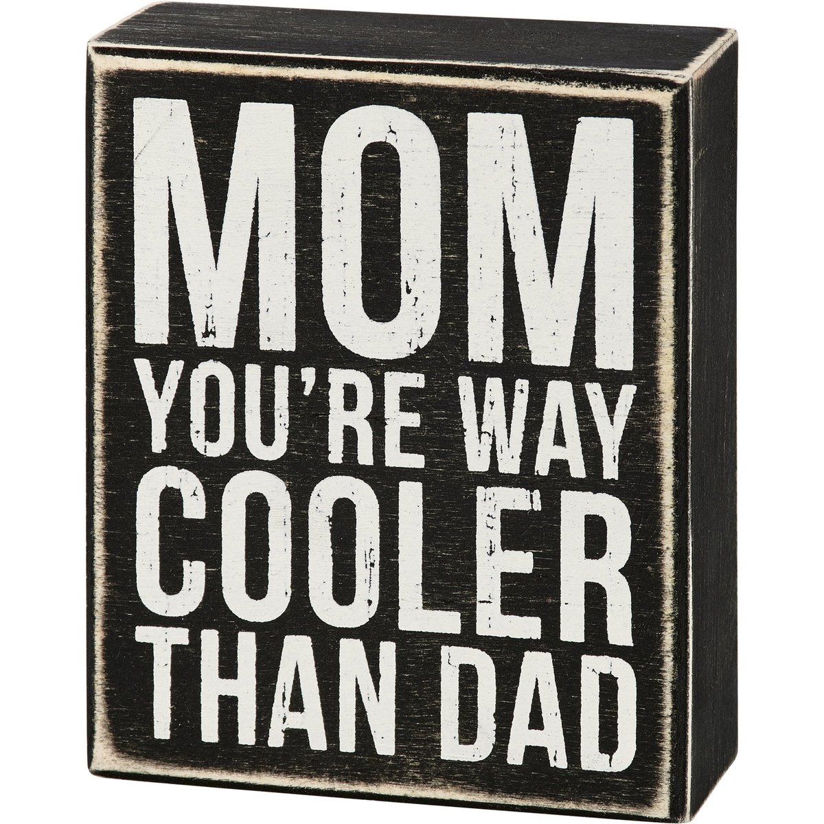 A classic black and white wooden box sign featuring a distressed "Mom - You're Way Cooler Than Dad" sentiment. Easy to hang or can free-stand alone.