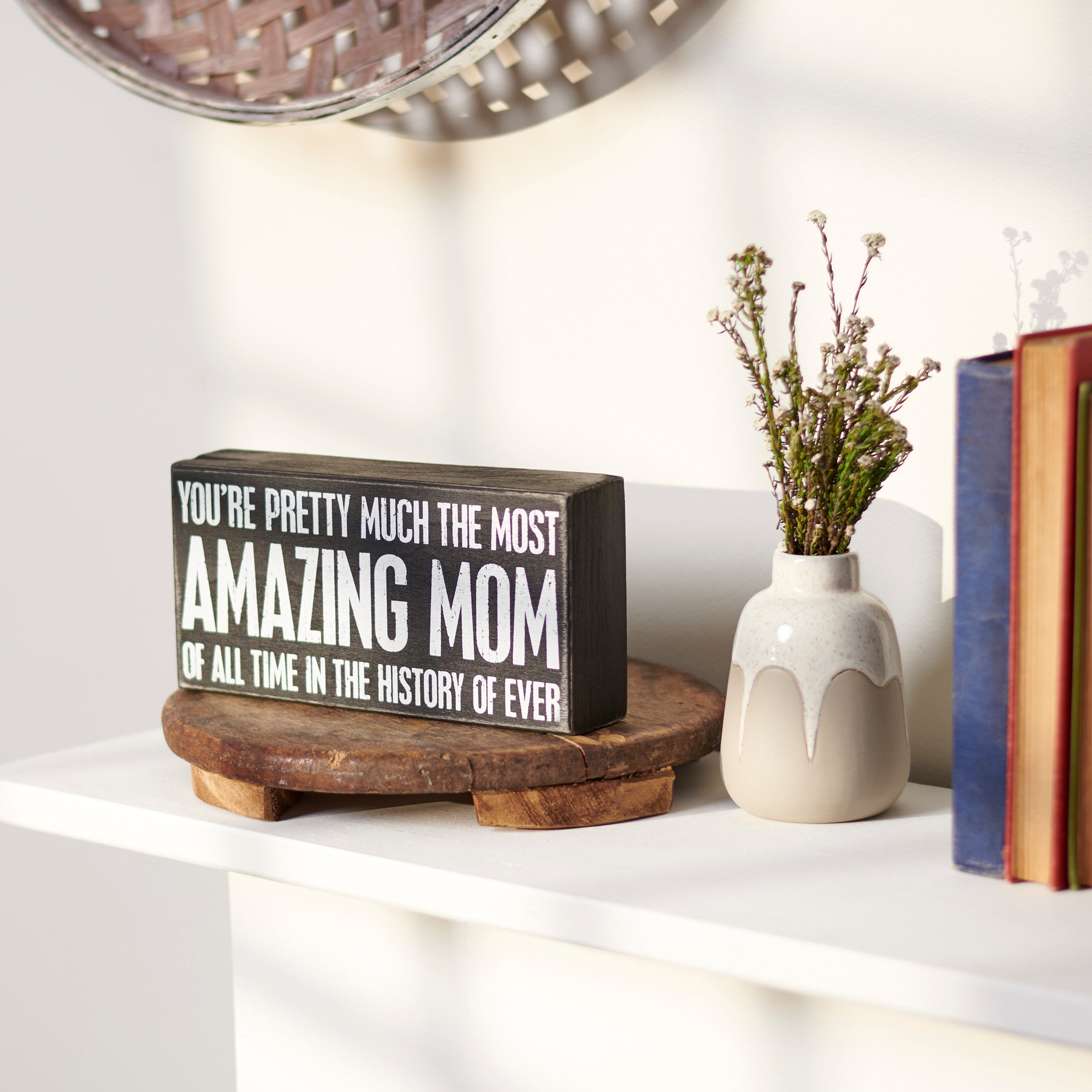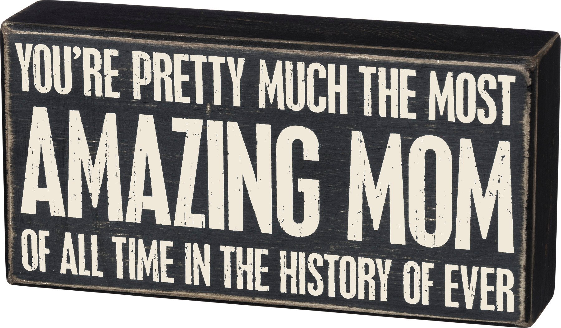 This classic black and white wooden box sign features a distressed "You're Pretty Much The Most Amazing Mom Of All Time In The History Of Ever" sentiment. Easy to hang or can free-stand alone.