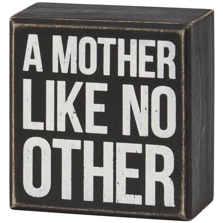 A classic black and white wooden box sign from our Mother's Day Collection displaying a fun mom-themed sentiment that reads "A Mother Like No Other." Mom box sign features distressed details with coordinating black color on sides and back. Our Mother Like No Other box sign is easy to hang or can free-stand alone. A fun Mother's Day gift that can be easily displayed in any home or work space.