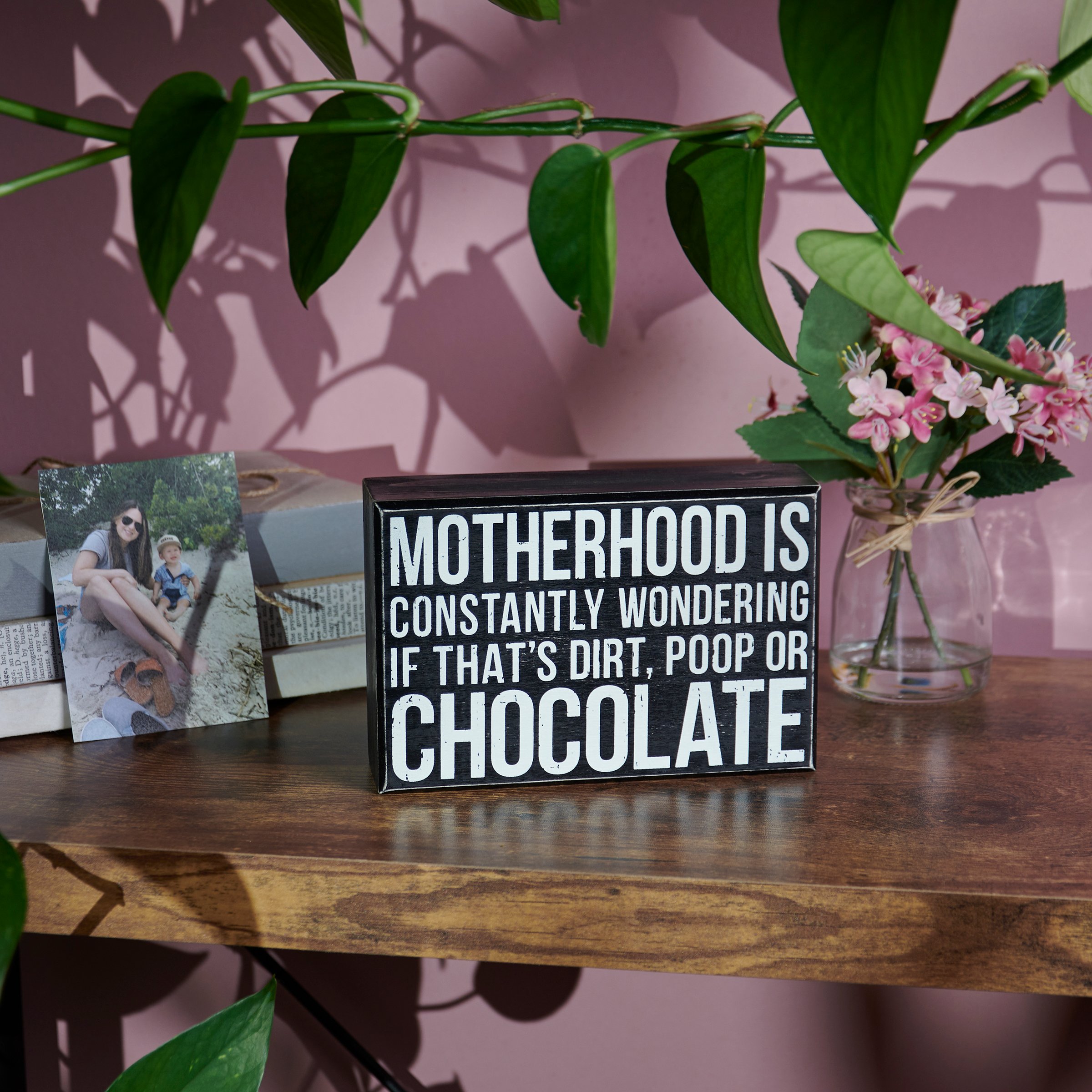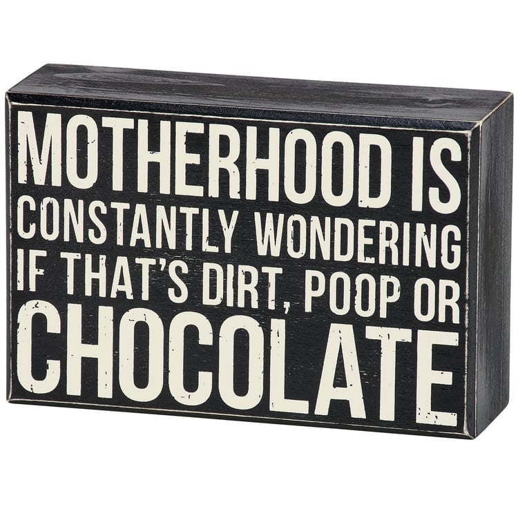 A classic black and white wooden box sign from our Box Sign Collection displaying a humorous mom-themed sentiment that reads "Motherhood Is Constantly Wondering If That's Dirt, Poop, Or Chocolate." Box sign features distressed details with coordinating black color on sides and back. Our Motherhood box sign is easy to hang or can free-stand alone. A fun gift perfect for Mother's Day or as an everyday home accent.