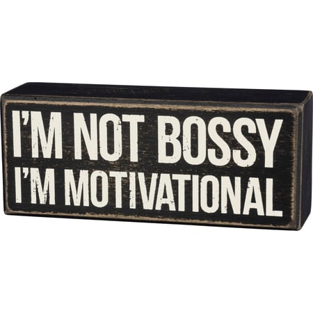 A classic black and white wooden box sign featuring a distressed "I'm Not Bossy - I'm Motivational" sentiment. Easy to hang or can free-stand alone.