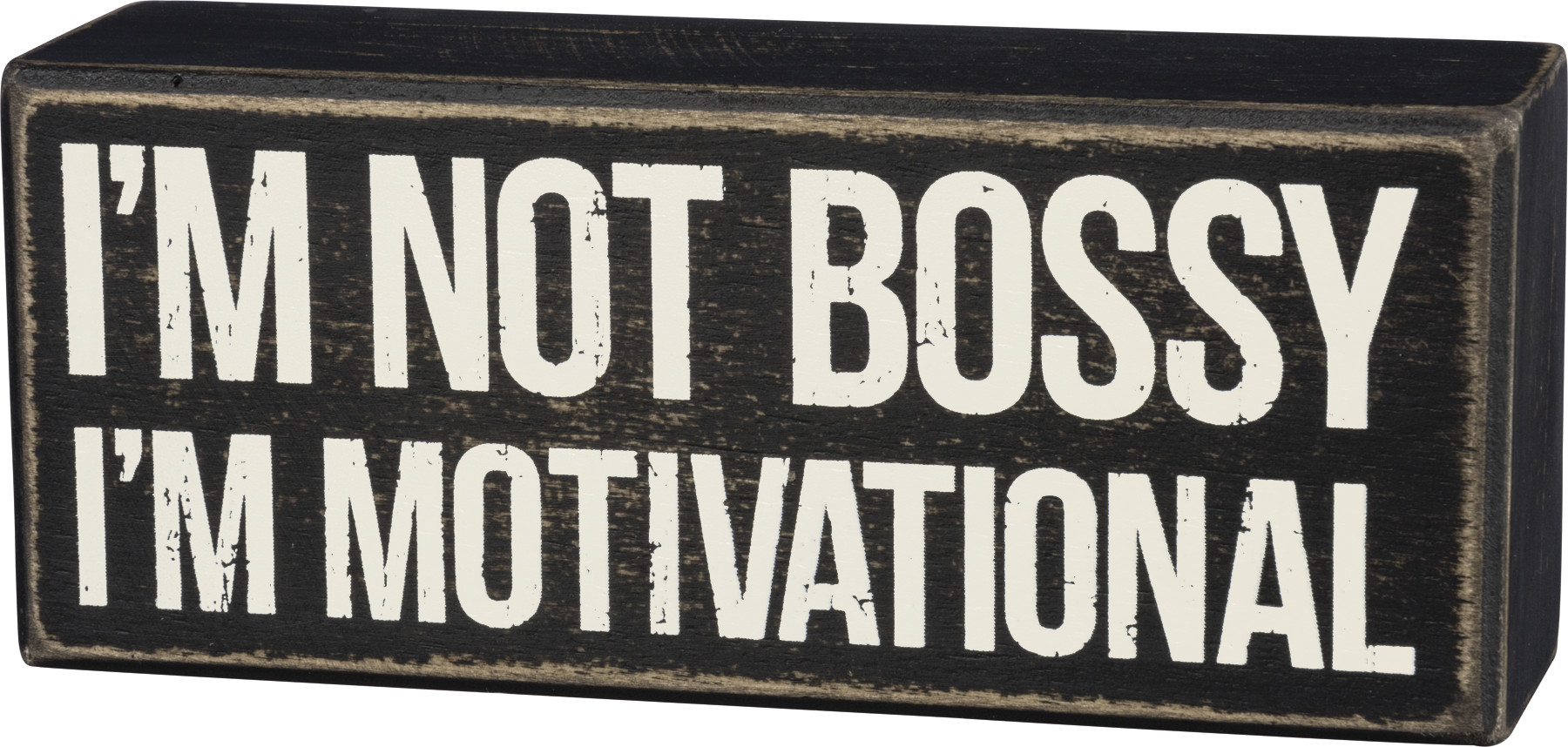 A classic black and white wooden box sign featuring a distressed "I'm Not Bossy - I'm Motivational" sentiment. Easy to hang or can free-stand alone.