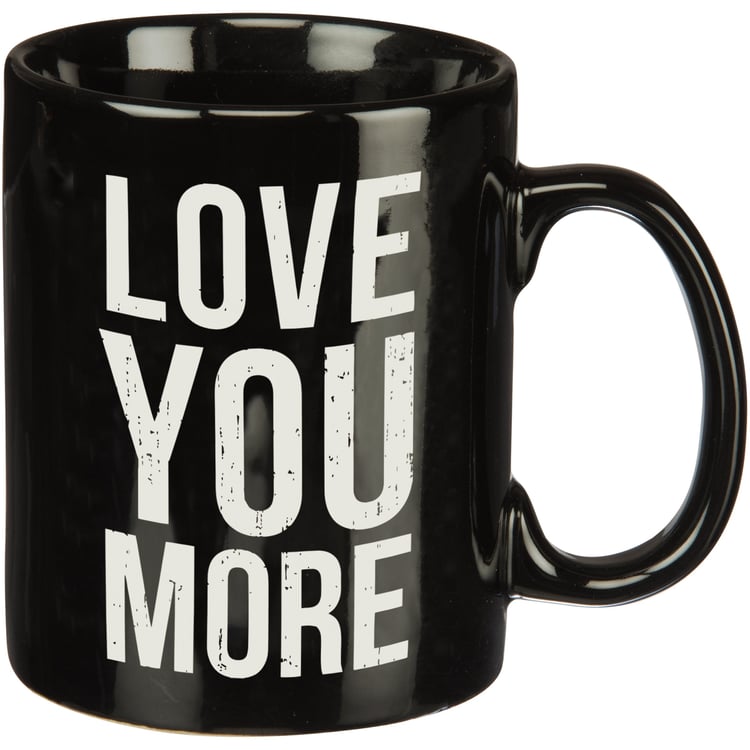 A black and white stoneware coffee mug from our Drinkware & Accessories lends a double-sided and distressed "Love You More" sentiment. Microwave, oven, dishwasher, and food safe. The Love You More mug holds 20 oz.