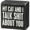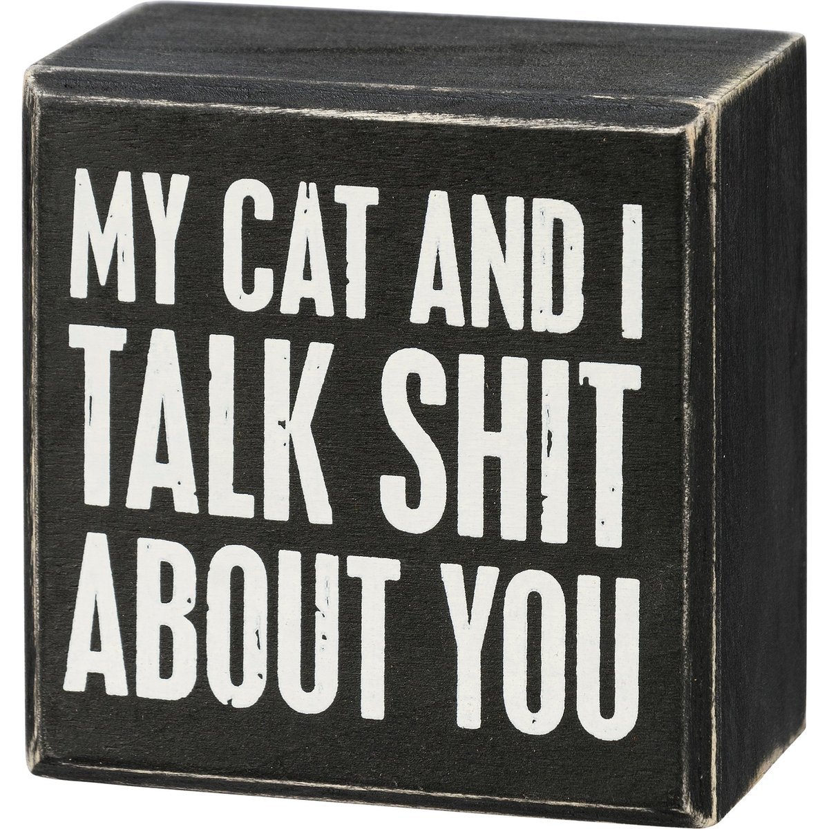 A classic black and white wooden box sign displaying a sarcastic pet inspired sentiment that reads "My Cat And I Talk Shit About You." Funny pet box sign features distressed details with coordinating black color on sides and back. Our My Cat And I sign is easy to hang or can free-stand alone. A fun pet-themed gift that can be easily displayed in any home or work space.