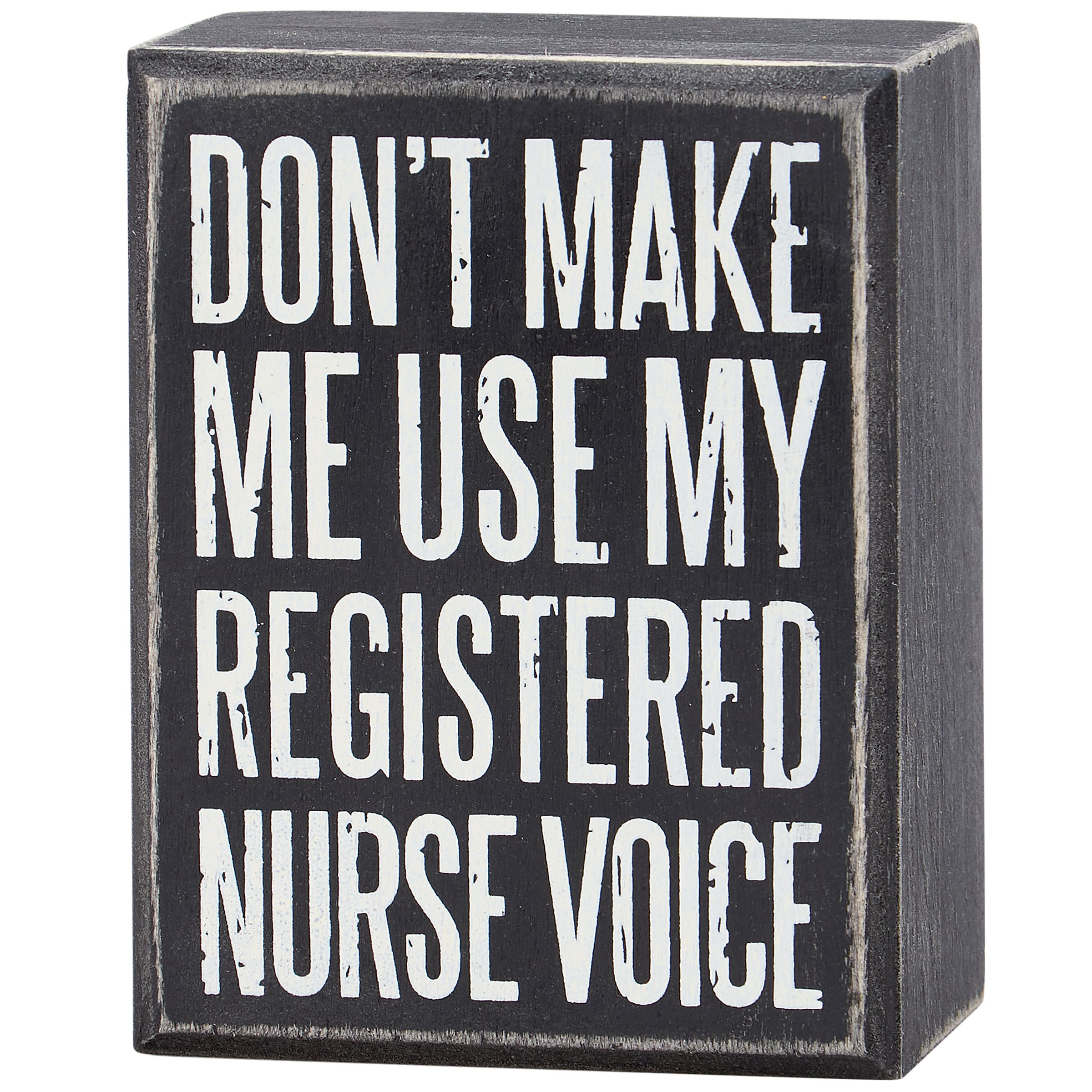 A classic black and white wooden box sign from our Box Sign Collection displaying a fun nurse inspired sentiment that reads "Don't Make Me Use My Registered Nurse Voice." Funny nurse box sign features distressed details with coordinating black color on sides and back. Our My Registered Nurse Voice box sign is easy to hang or can free-stand alone. A fun nurse gift that can be easily displayed in any home or work space.