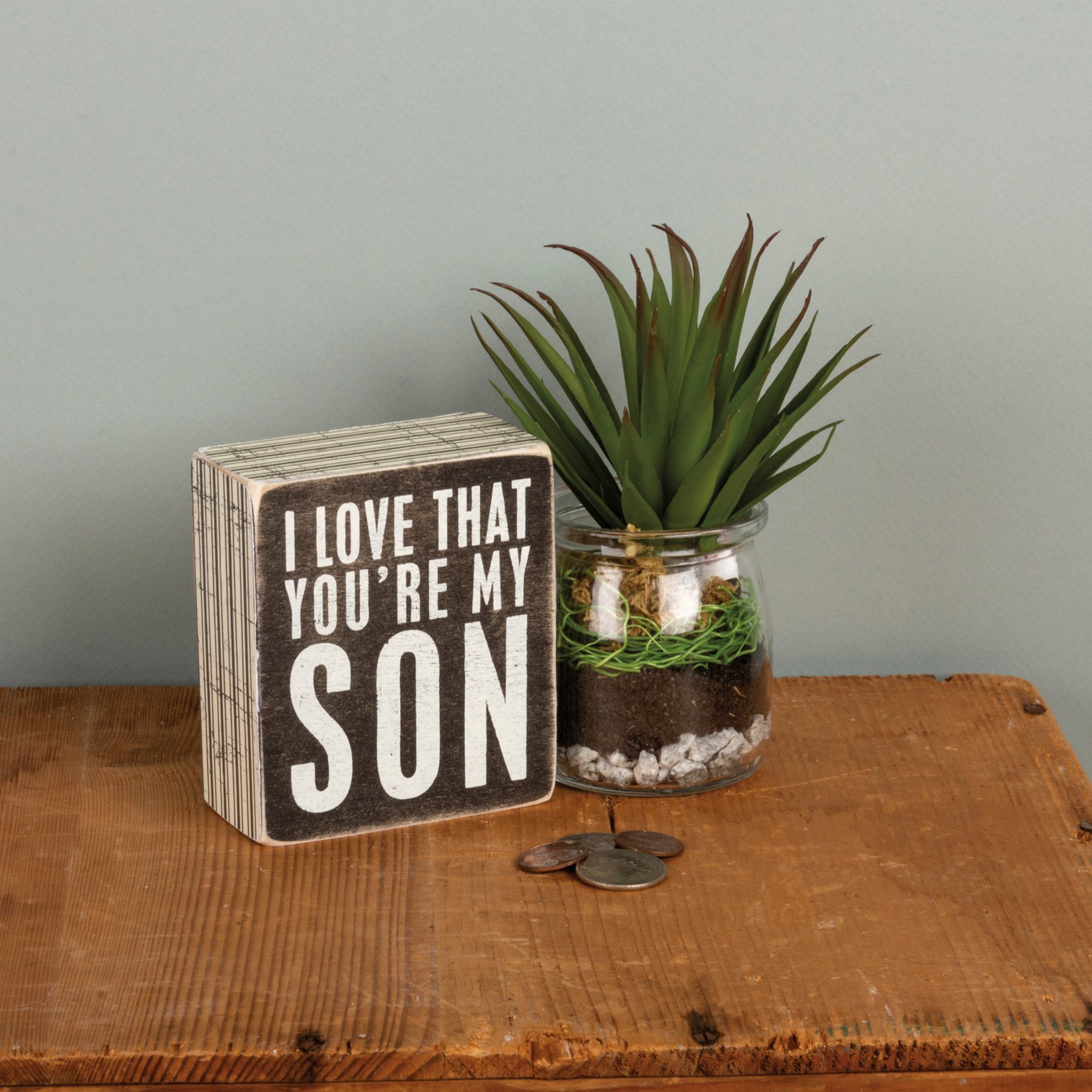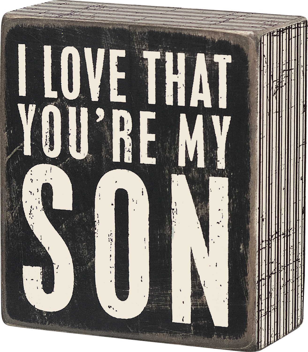 A classic black and white wooden box sign featuring a distressed "I Love That You're My Son" sentiment with striped trim designs. Easy to hang or can free-stand alone.