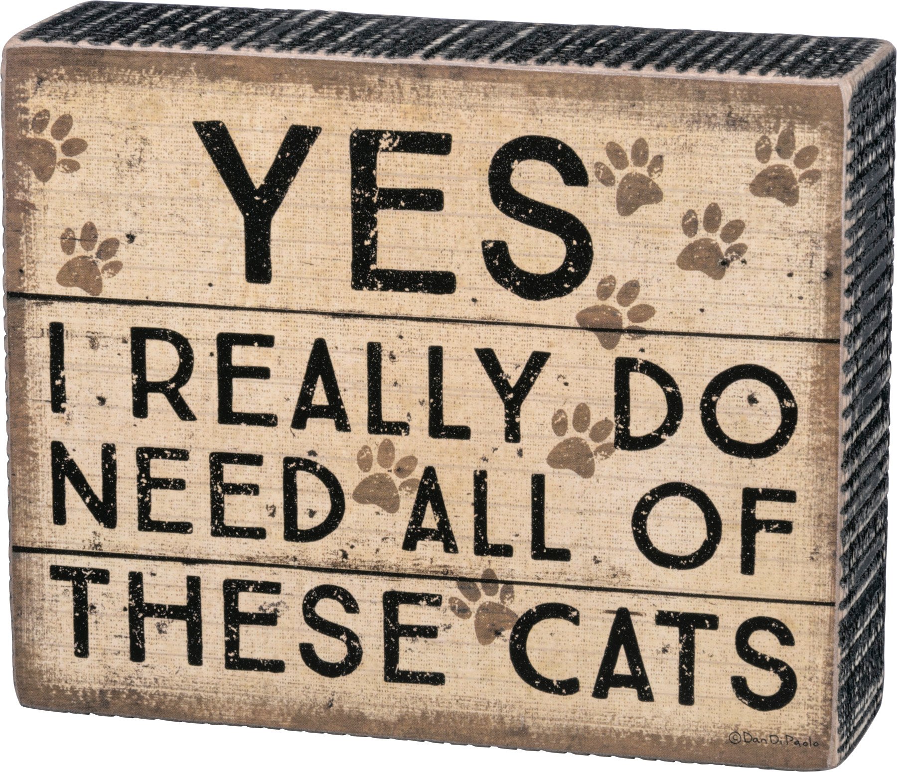 A classic black and white wooden box sign from our Pet Collection displaying a rustic slat wood design with a fun pet inspired sentiment that reads "Yes - I Really Do Need All These Cats." Funny pet box sign features distressed details with coordinating black color on sides and back. Our Need These Cats sign is easy to hang or can free-stand alone. A fun pet-themed gift that can be easily displayed in any home or work space.