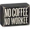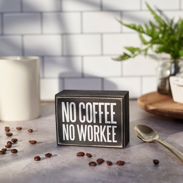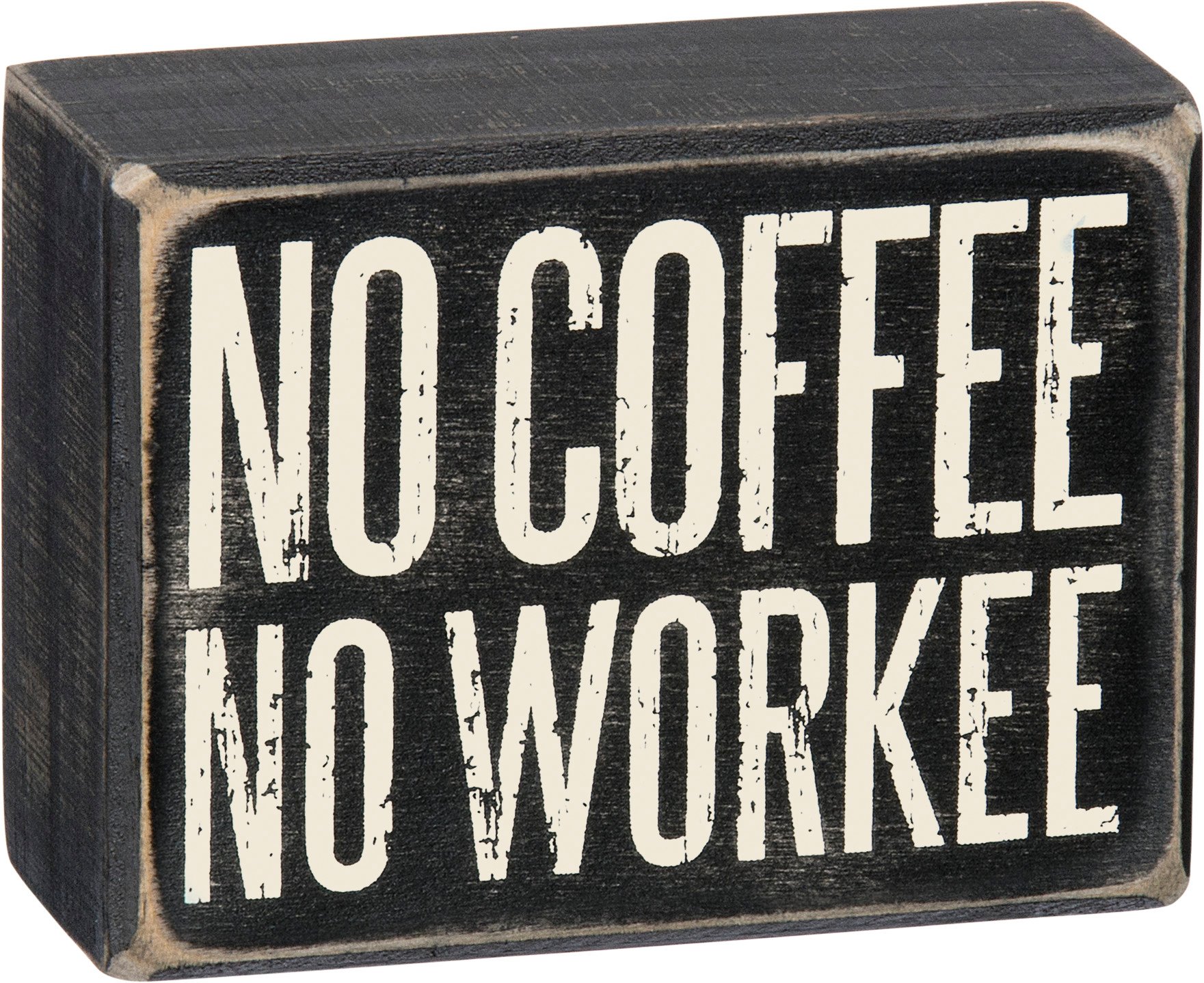 A classic black and white wooden box sign from our Box Sign Collection features a distressed "No Coffee - No Workee" sentiment. The No Coffee No Workee box sign is easy to hang or can free-stand alone. Not eligible for discounting.