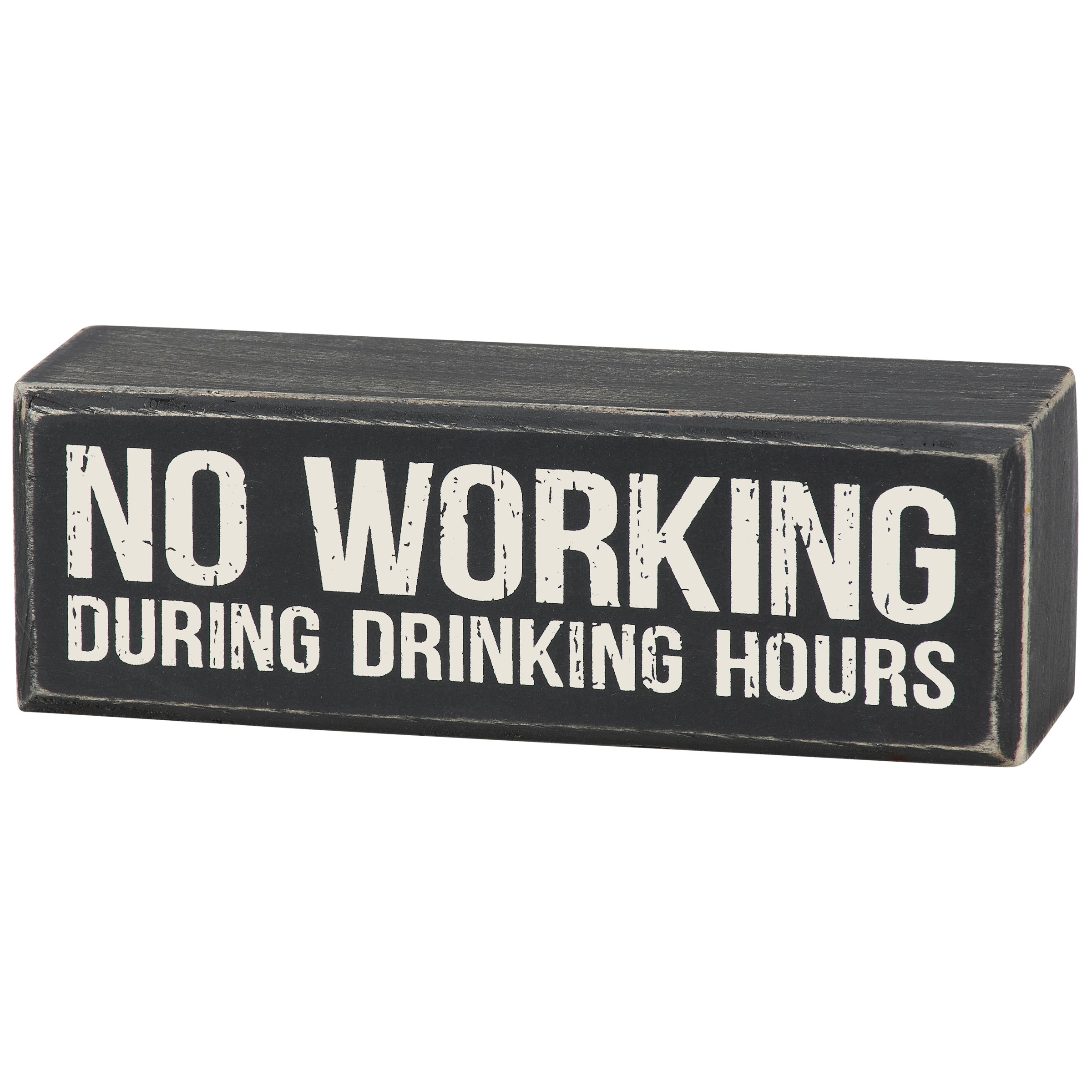 A classic black and white wooden box sign from our Box Sign Style Collection displaying a funny alcohol inspired sentiment that reads "No Working During Drinking Hours." This funny alcohol box sign features distressed details with a coordinating black color on sides and back. Our No Working During Drinking Hours sign is easy to hang or can free-stand on a flat surface for display. A fun alcohol themed home accent that can be easily displayed to add personality to any home or work space.