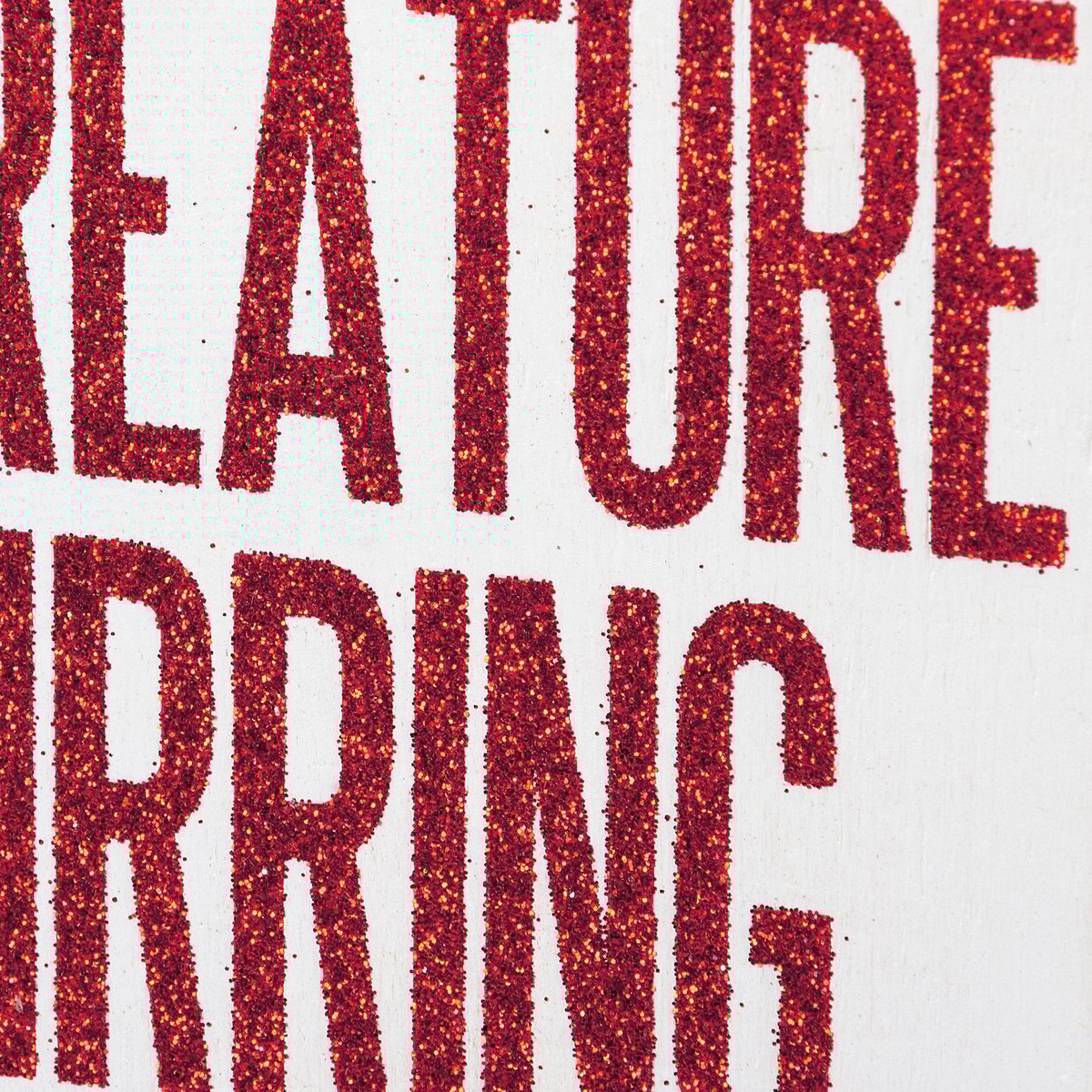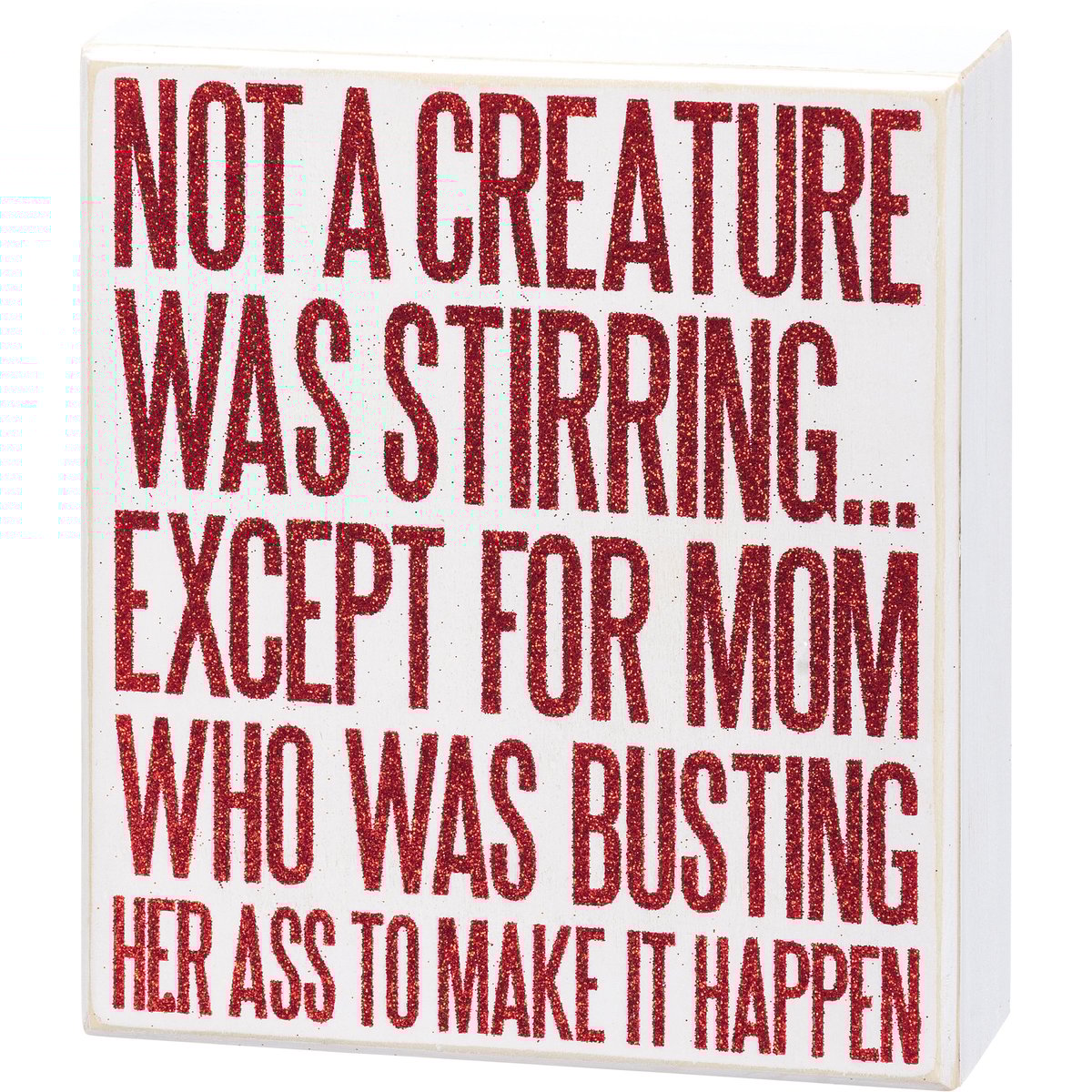 A white wooden box sign featuring a "Not A Creature Was Stirring…Except For Mom Who Was Busting Her Ass To Make It Happen" sentiment with red glitter details. Easy to hang or can free-stand alone.