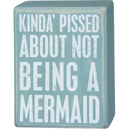 A wooden box sign featuring a distressed "Kinda Pissed About Not Being A Mermaid" sentiment in a beach-inspired palette. Complements well with existing decor or coordinating design pieces. Easy to hang or can free-stand alone on a shelf or mantel.