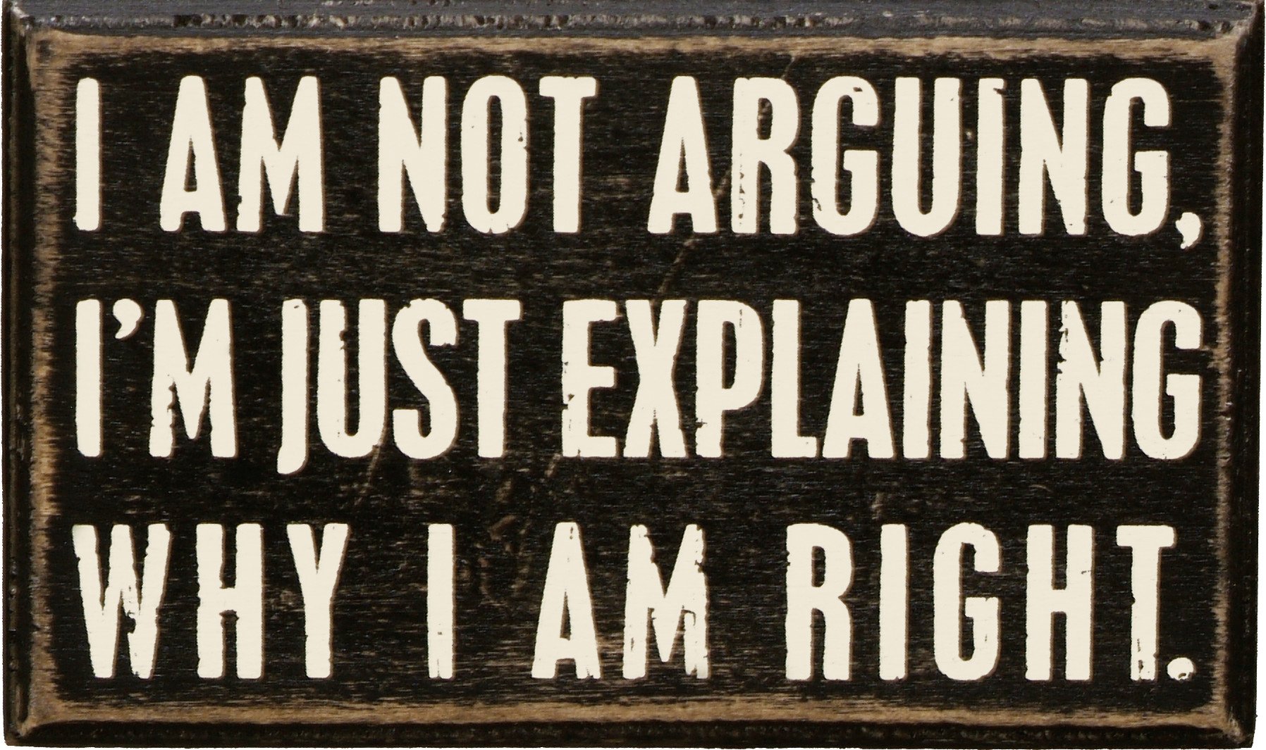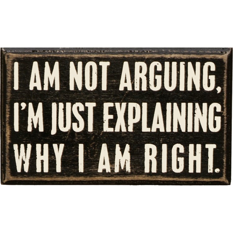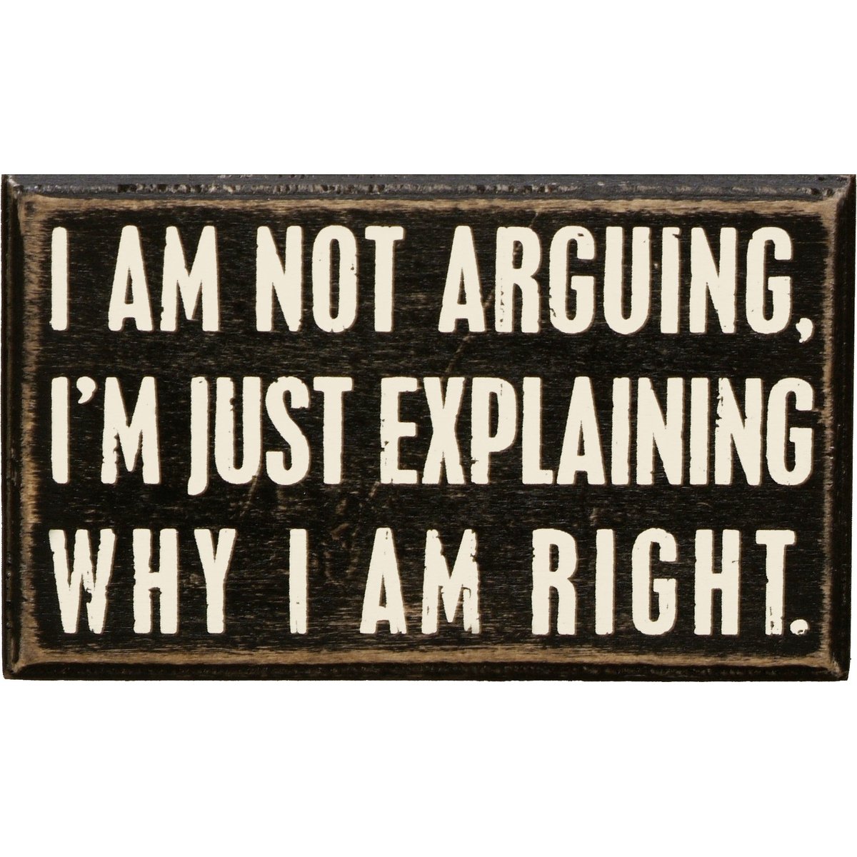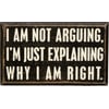 A classic black and white wooden box sign featuring a distressed "I Am Not Arguing, I'm Just Explaining Why I Am Right" sentiment. Easy to hang or can free-stand alone. Not eligible for discounting.