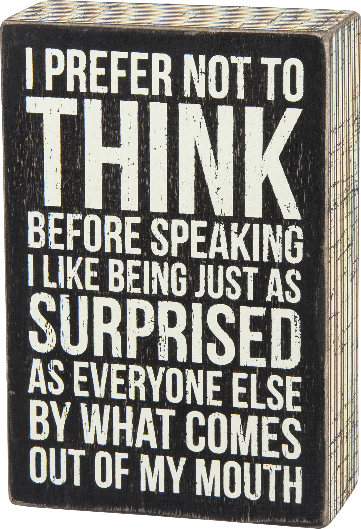 A classic black and white wooden box sign featuring a distressed "I Prefer Not To Think Before Speaking - I Like Being Just As Surprised As Everyone Else By What Comes Out Of My Mouth" sentiment with striped trim designs. Easy to hang or can free-stand alone.