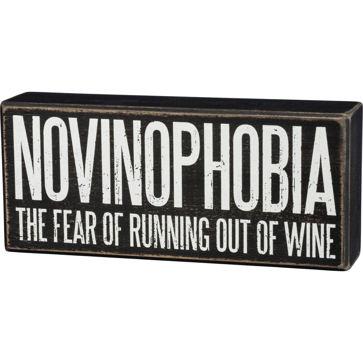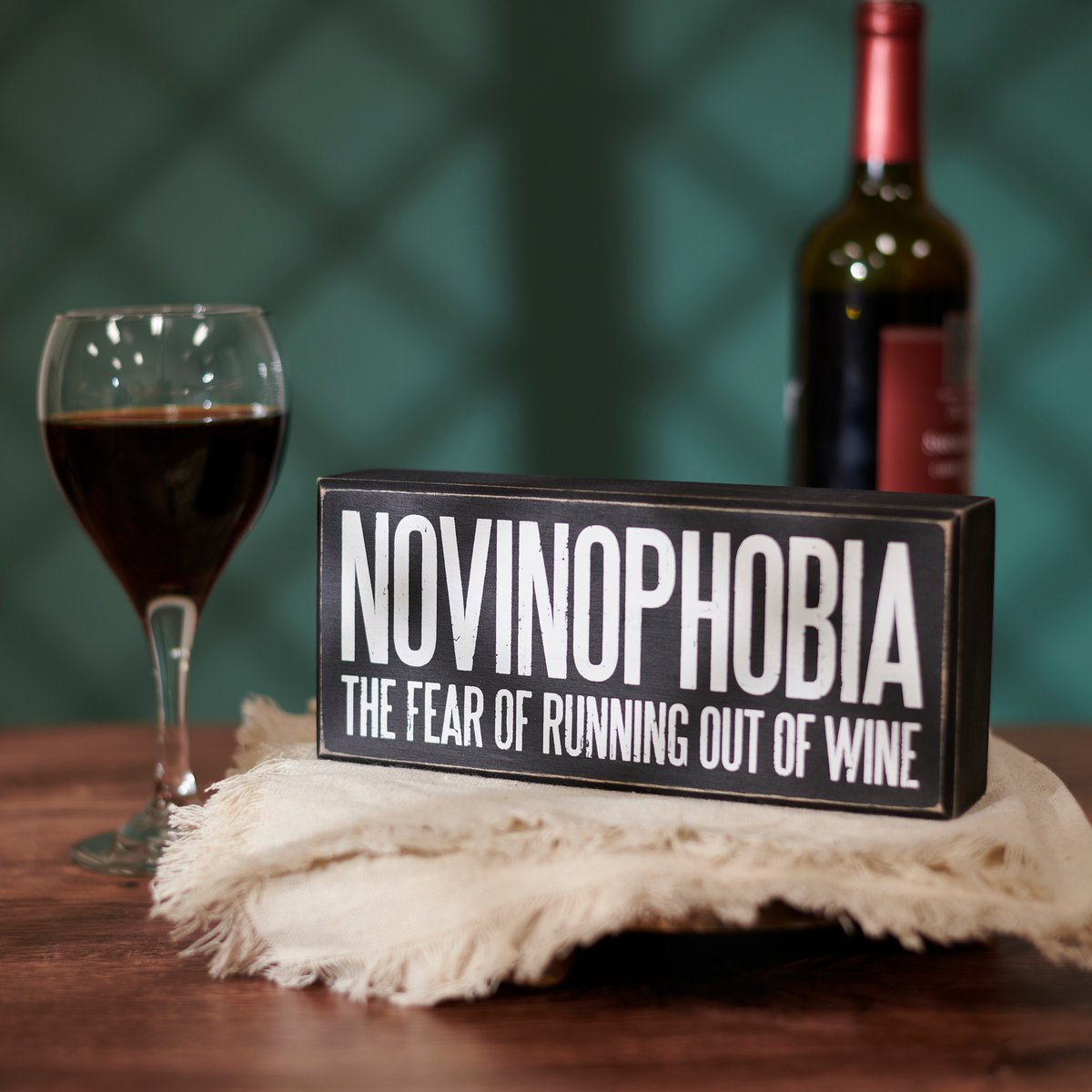 A classic black and white wooden box sign lending a distressed "Novinophobia - The Fear Of Running Out Of Wine" sentiment. Easy to hang or can free-stand alone.