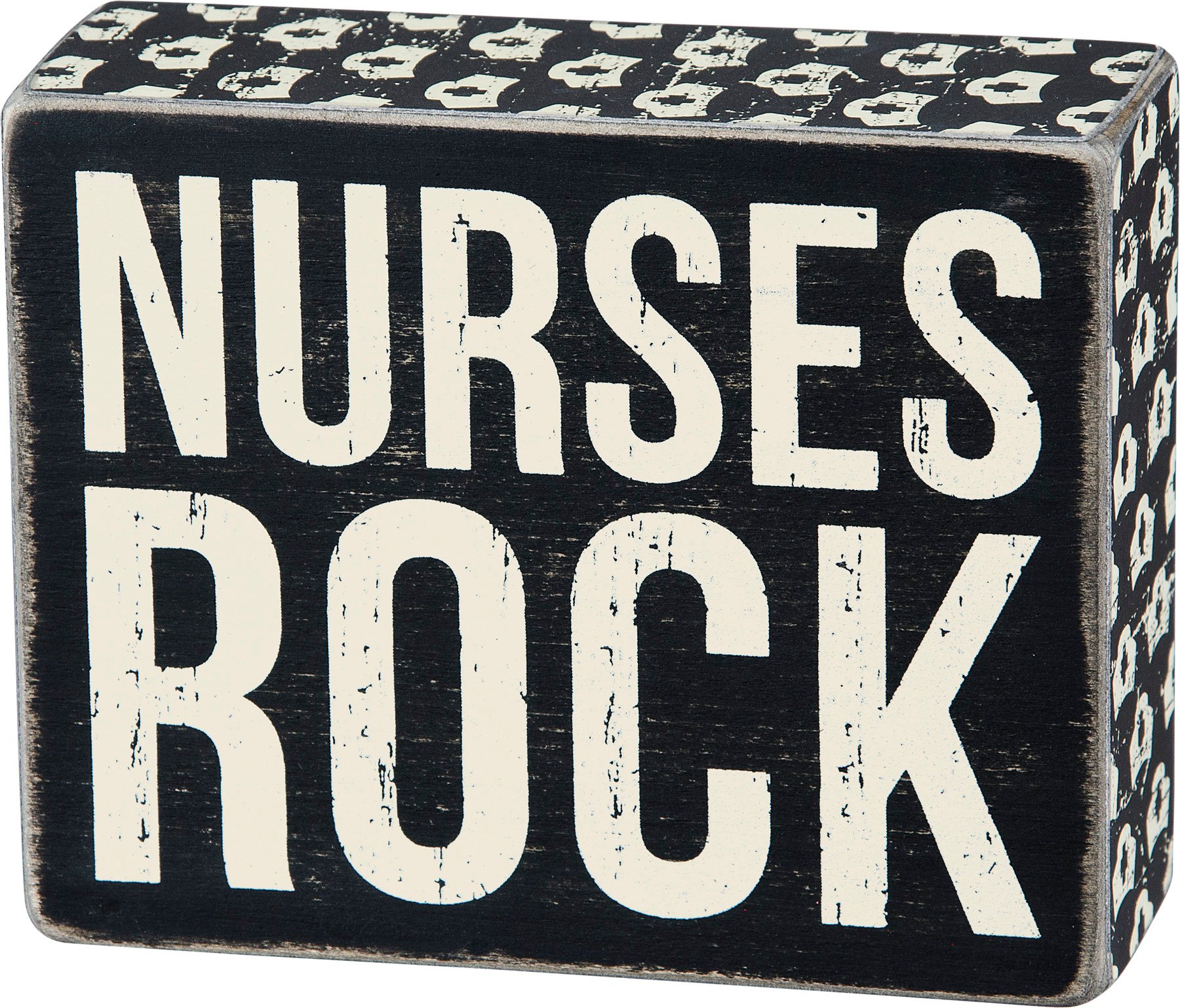Celebrate healthcare workers with this easy to hang box sign from our Nurse Collection displaying a classic black and white box sign style with distressed details and "Nurses Rock" sentiment. Box sign features coordinating black color and nurse cap pattern on sides. Our Nurses Rock box sign is easy to hang or can free-stand alone.
