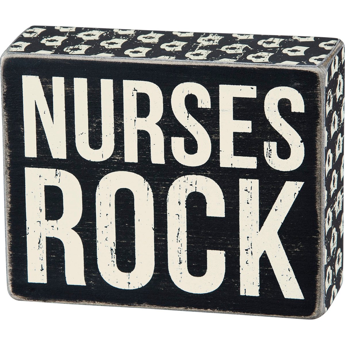 Celebrate healthcare workers with this easy to hang box sign from our Nurse Collection displaying a classic black and white box sign style with distressed details and "Nurses Rock" sentiment. Box sign features coordinating black color and nurse cap pattern on sides. Our Nurses Rock box sign is easy to hang or can free-stand alone.