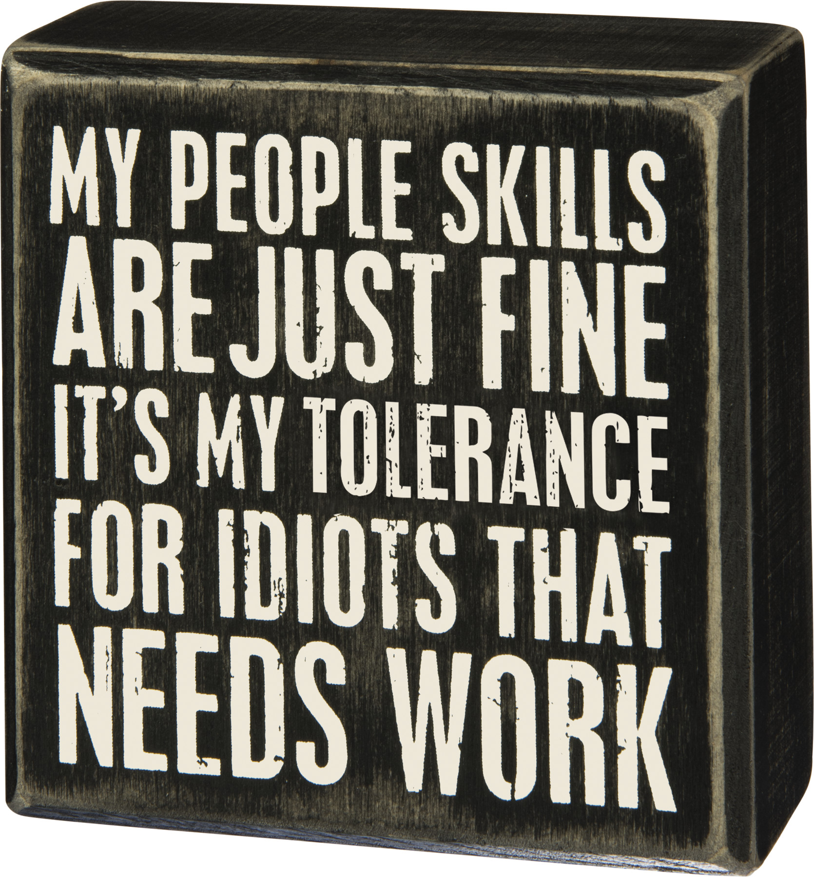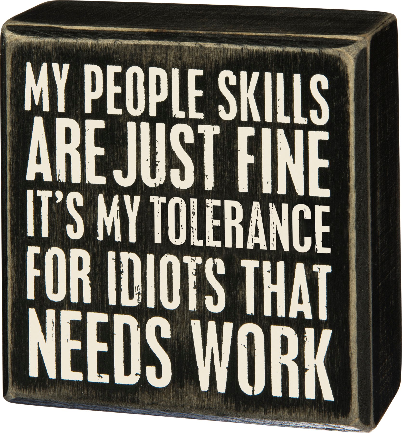 A classic black and white wooden box sign featuring a distressed "My People Skills Are Just Fine - It's My Tolerance For Idiots That Needs Work" sentiment. Easy to hang or can free-stand alone.