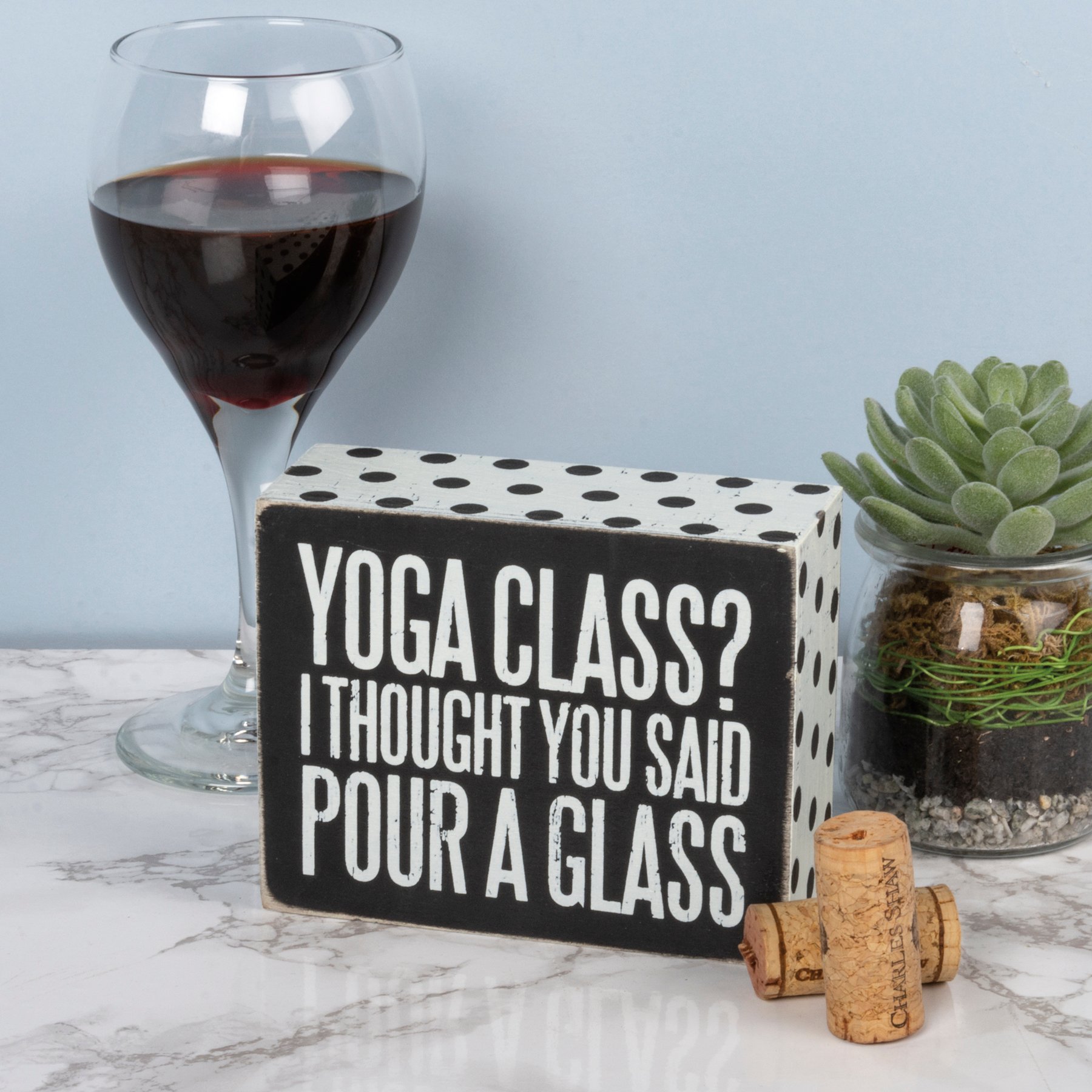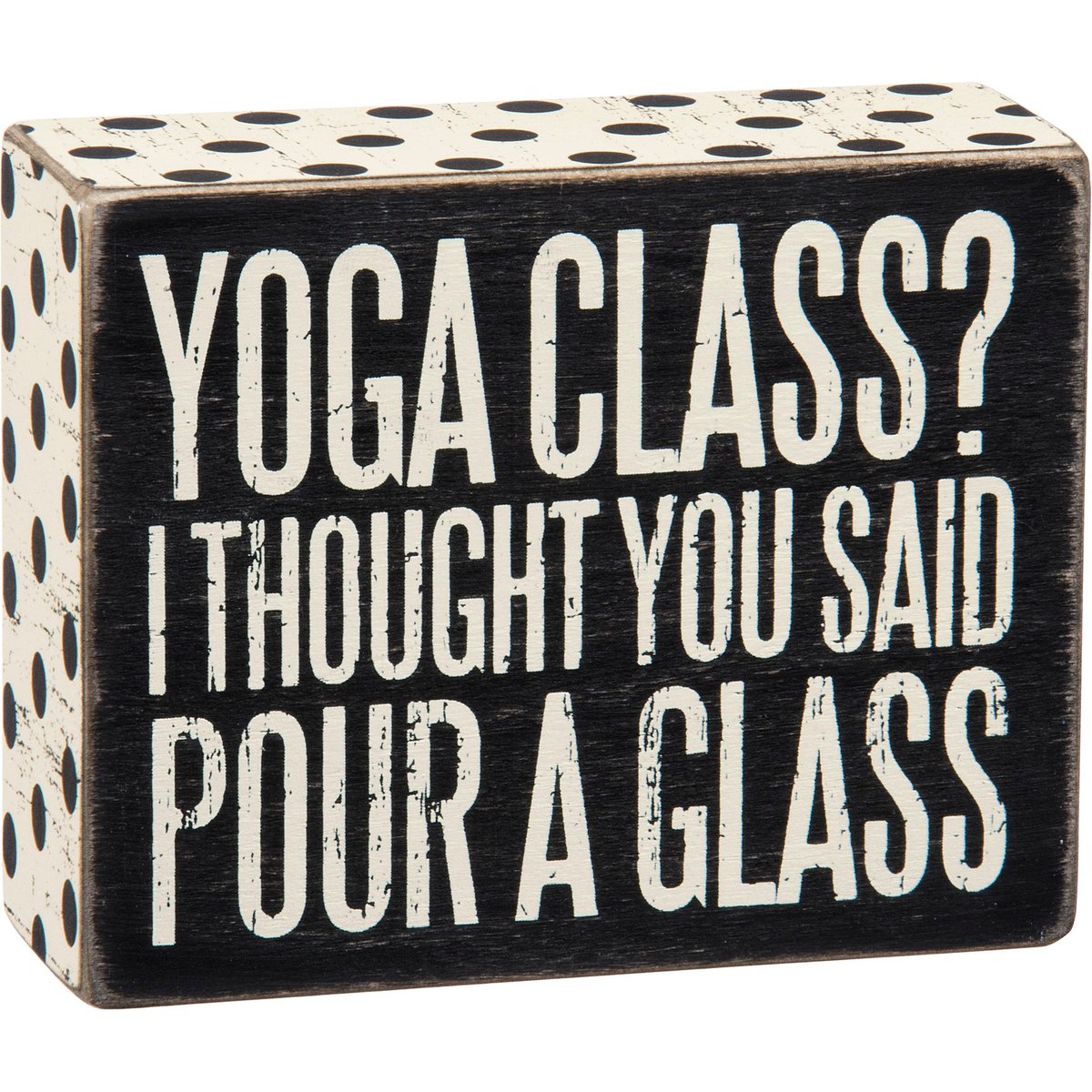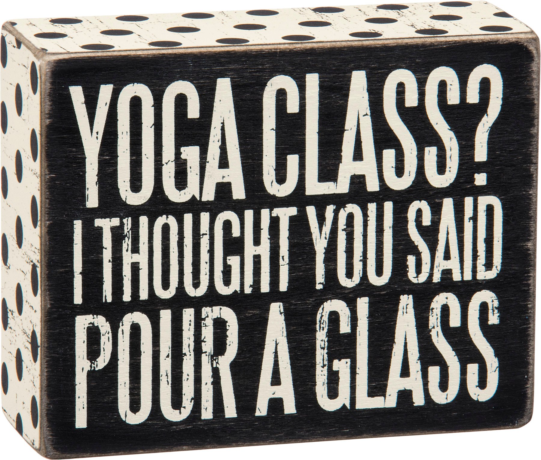 A classic black and white wooden box sign lending a distressed "Yoga Class? I Thought You Said Pour A Glass" sentiment with polka dot patterned trim. Easy to hang or can free-stand alone.