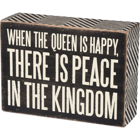 A classic black and white wooden box sign featuring a distressed "When The Queen Is Happy, There Is Peace In The Kingdom" sentiment with zigzag trim designs. Easy to hang or can free-stand alone.