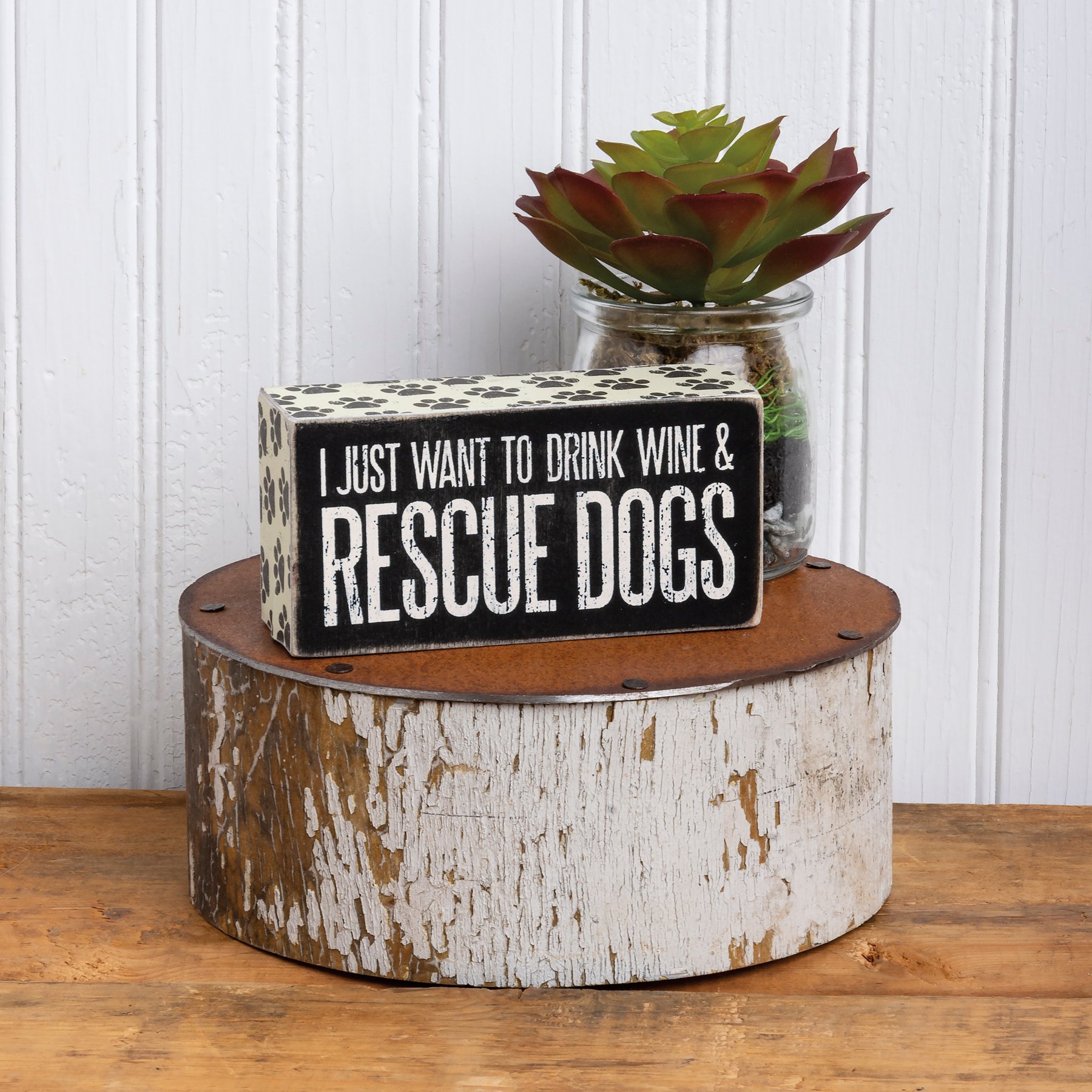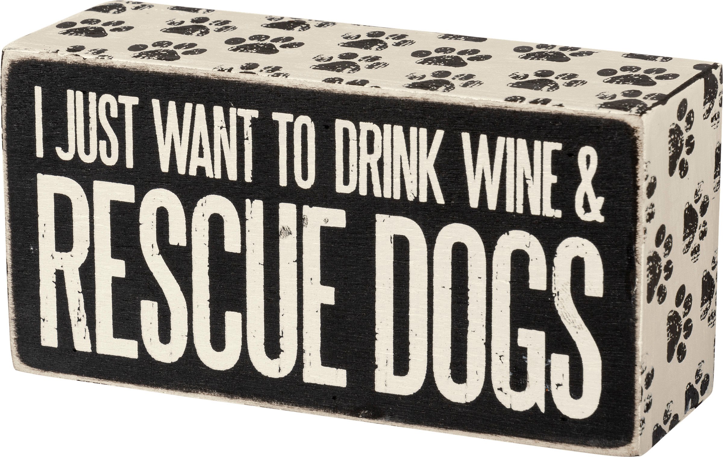 A classic black and white wooden box sign featuring a distressed "I Just Want To Drink Wine & Rescue Dogs" sentiment with paw print trim designs. Our Rescue Dogs box sign is easy to hang or can free-stand alone.