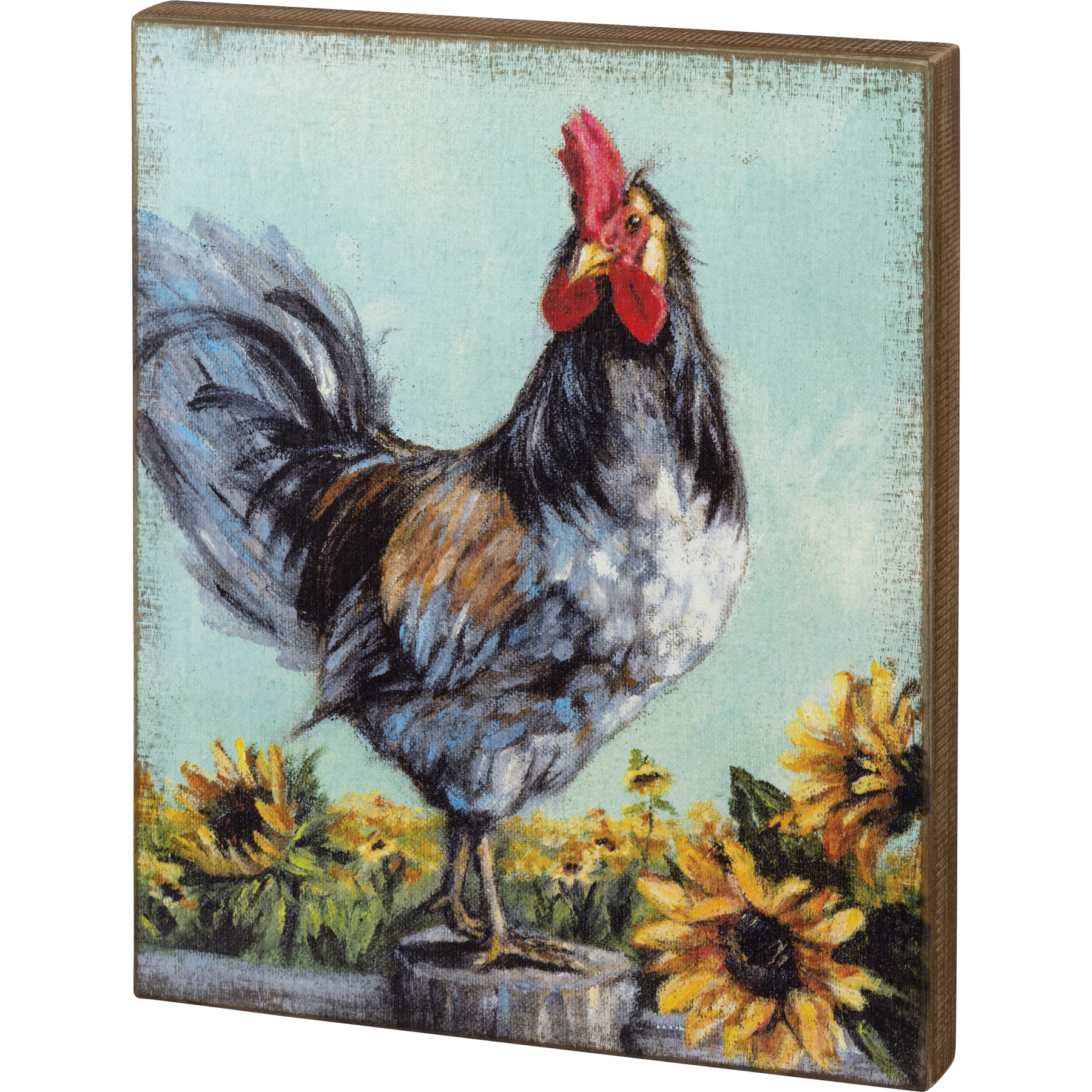 A wooden box sign featuring a rooster in a sunflower field. Design is replicated from original artwork painted onto burlap canvas, giving the art a unique depth and texture. Easy to hang or can free-stand alone.