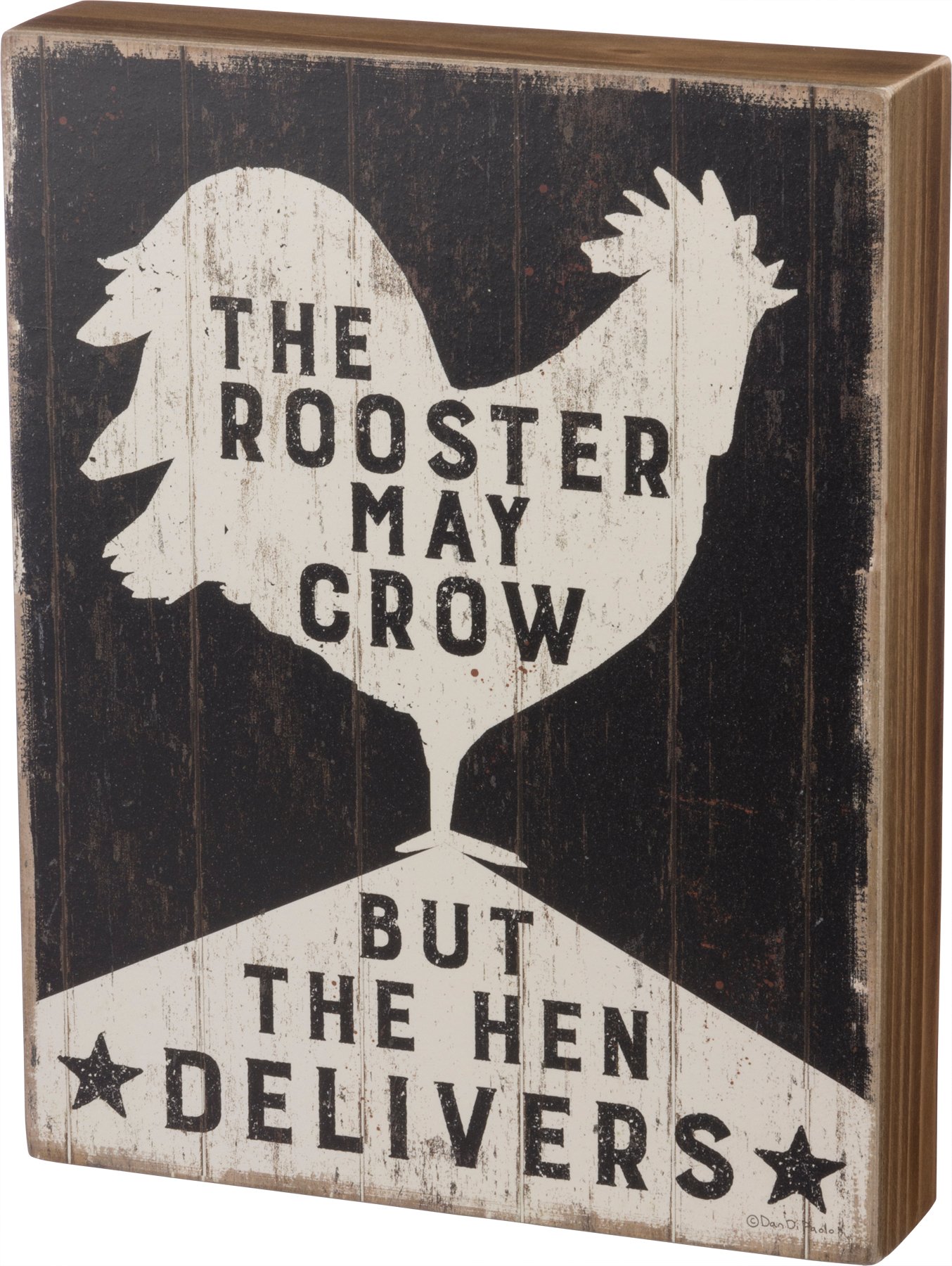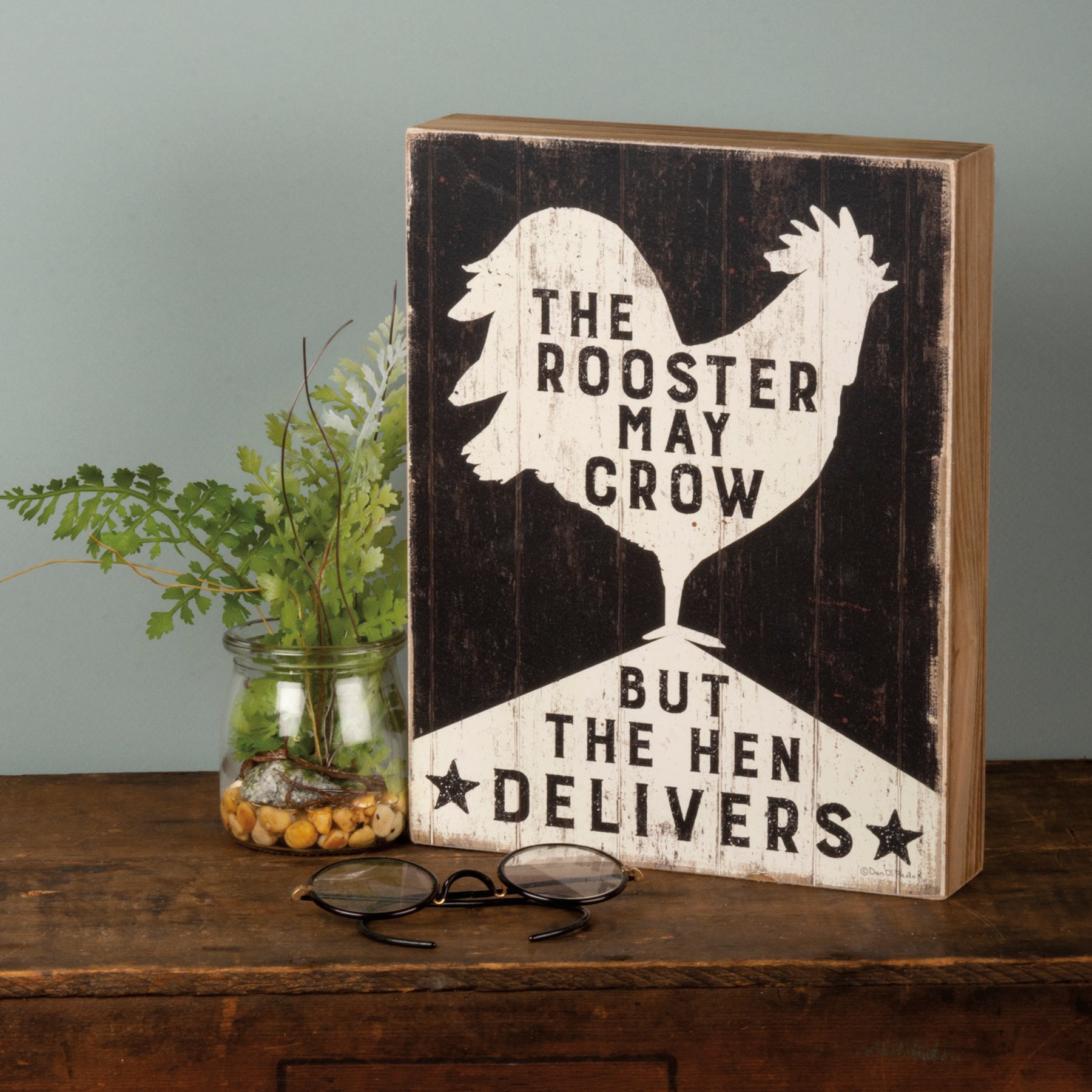 A rustic wooden box sign lending a distressed "The Rooster May Grow - But The Hen Delivers" sentiment with rooster silhouette design in a neutral palette. Complements well with coordinating design pieces or existing decor. Easy to hang or can free-stand alone.