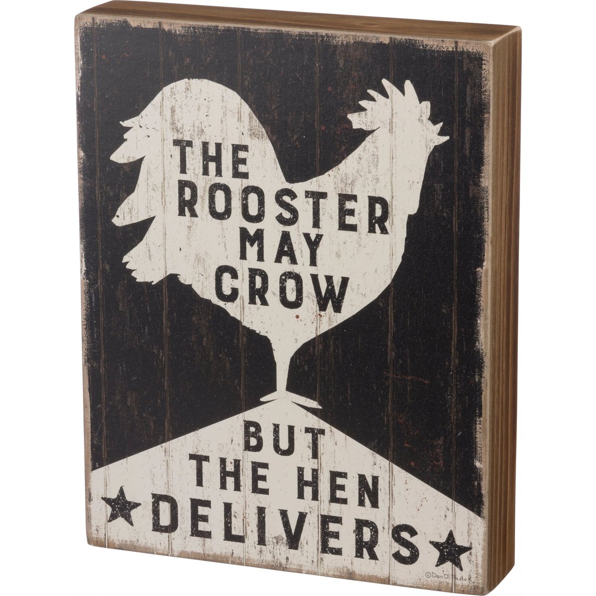 A rustic wooden box sign lending a distressed "The Rooster May Grow - But The Hen Delivers" sentiment with rooster silhouette design in a neutral palette. Complements well with coordinating design pieces or existing decor. Easy to hang or can free-stand alone.