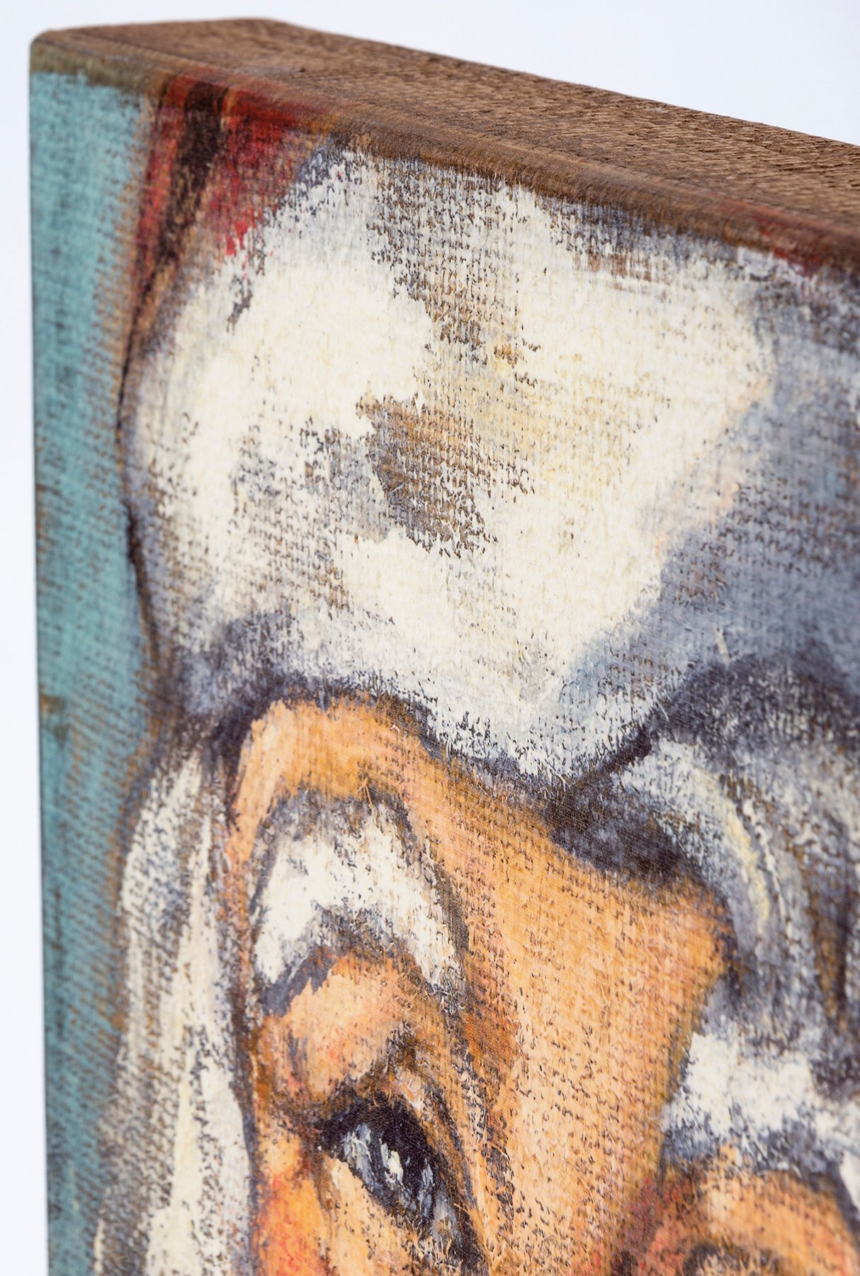 A wooden box sign from our Christmas Collection featuring a Santa painting. Design is replicated from original artwork painted onto burlap canvas, giving the art a unique depth and texture. Easy to hang or can free-stand alone.