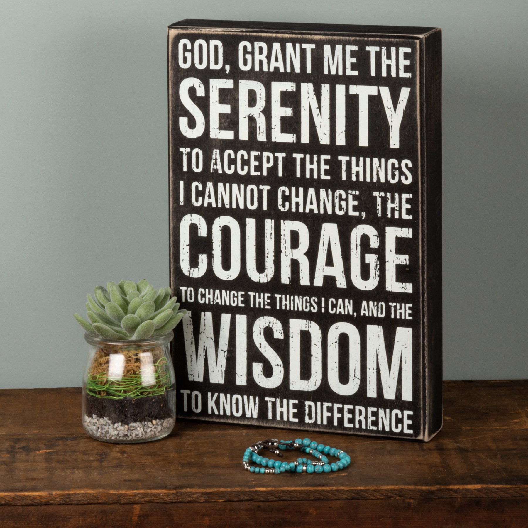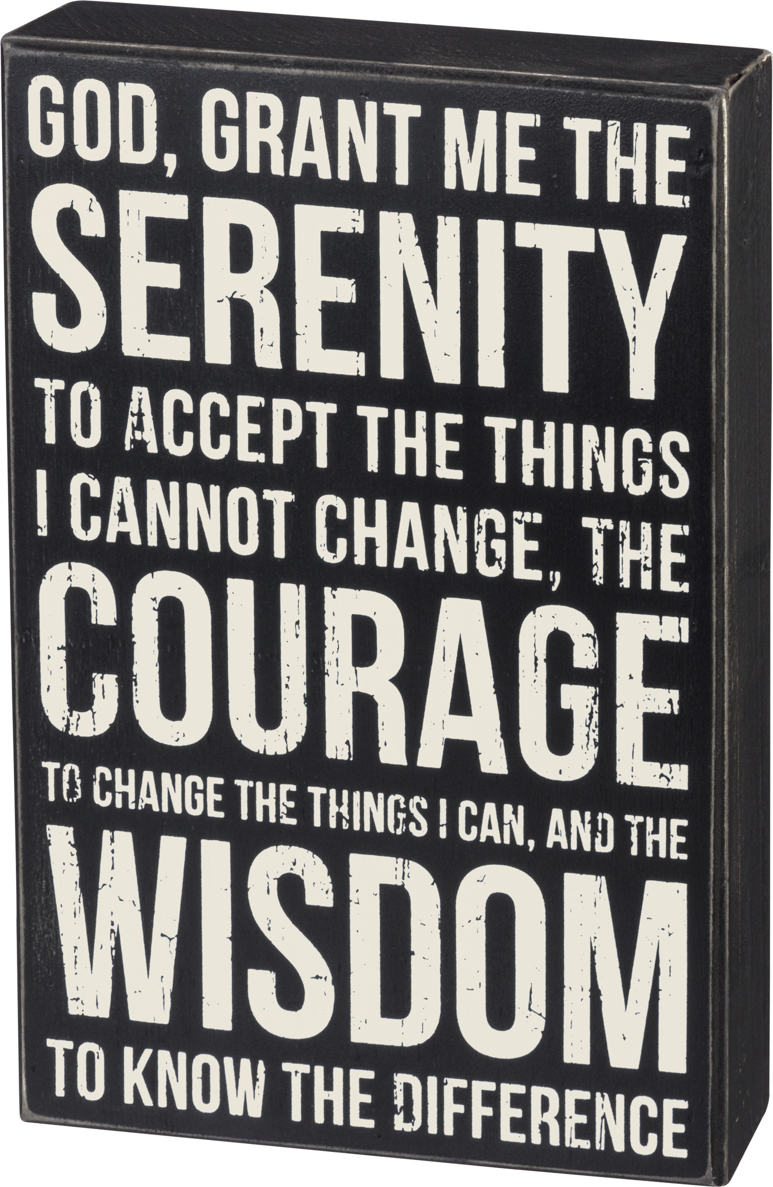 A classic black and white wooden box sign featuring a distressed "God, Grant Me The Serenity To Accept The Things I Cannot Change, The Courage To Change The Things I Can, And The Wisdom To Know The Difference" sentiment. Easy to hang or can free-stand alone.