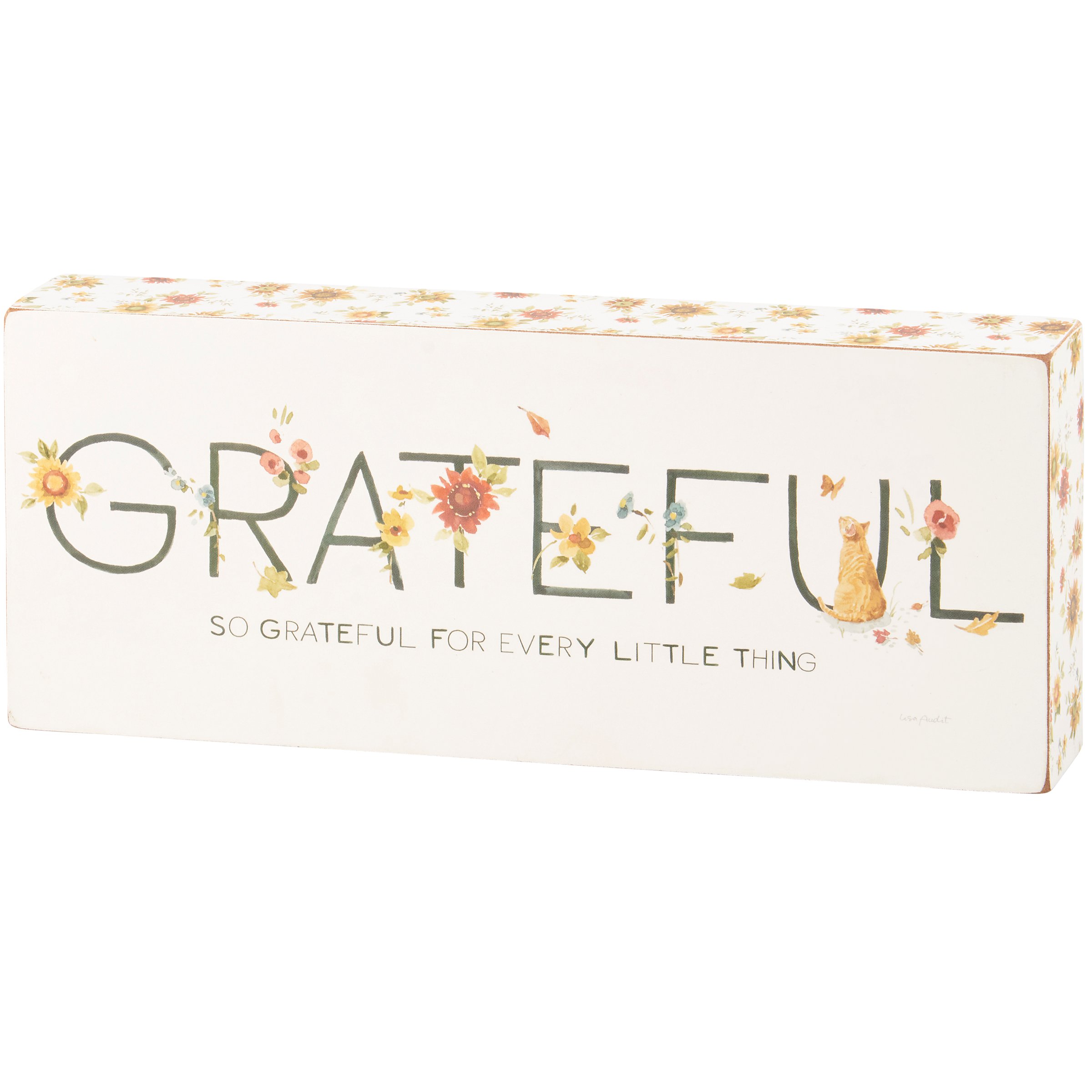 A wooden box sign from our Fall & Harvest Collection displaying hand painted designs of colorful flowers, a butterfly, and a cat on a fall inspired sentiment that reads "Grateful - So Grateful For Every Little Thing." Design is replicated from original art hand painted in a delicate watercolor style. Box sign features a coordinating fall wildflower pattern on the sides and natural wood on the back. Our So Grateful sign is easy to hang or can free-stand alone. An inspirational seasonal home accent great for gifting that can be easily displayed in any home or work space.
