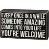 A classic wooden box sign featuring an "Every Once In A While Someone Amazing Comes Into Your Life…You're Welcome" sentiment. Easy to hang or can free-stand alone.
