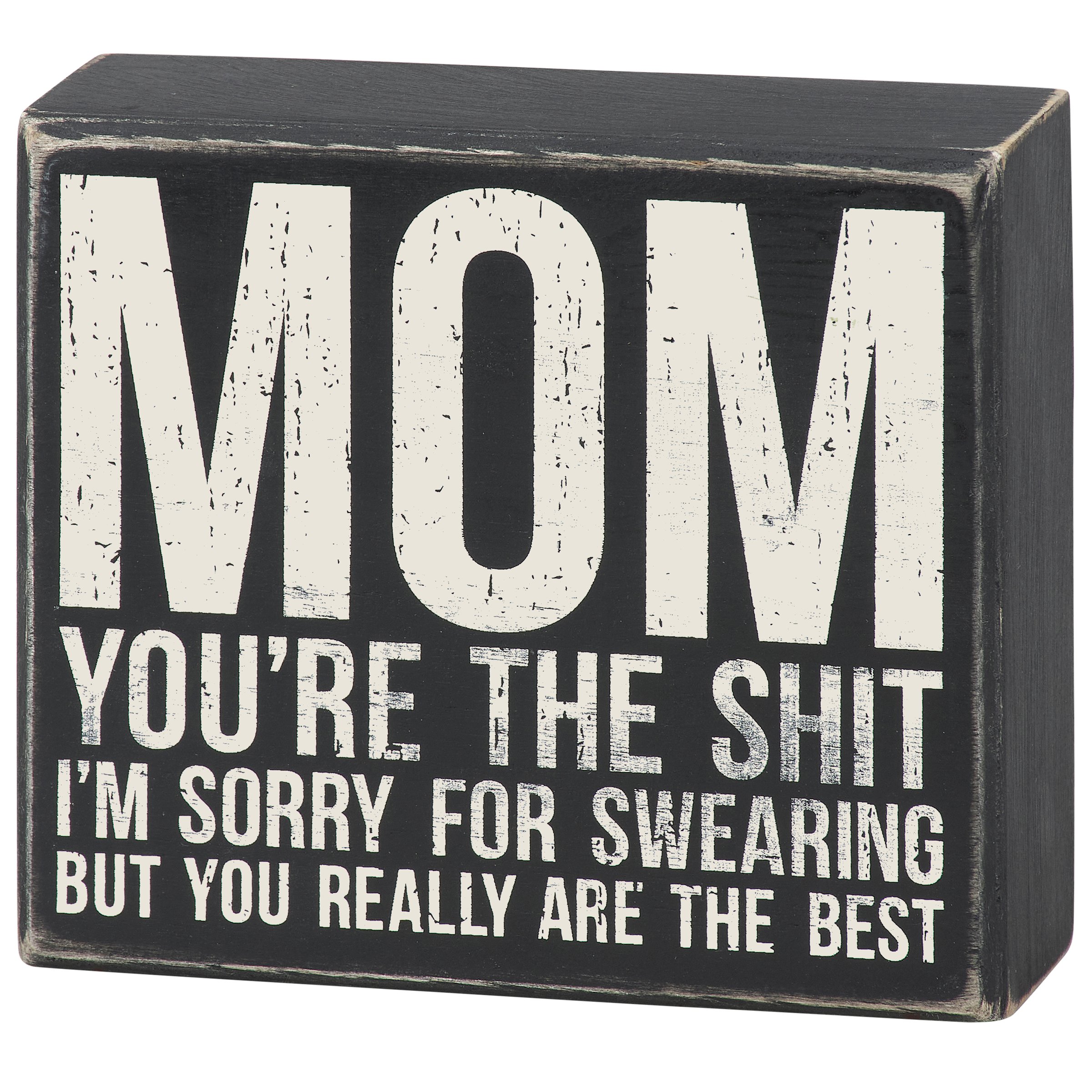 A classic black and white wooden box sign from our Mother's Day Collection displaying a funny mom inspired sentiment that reads "Mom You're The Shit - I'm Sorry For Swearing But You Really Are The Best." This fun mom box sign features distressed details with a coordinating black color on sides and back. Our Sorry For Swearing Mom sign is easy to hang or can free-stand on a flat surface for display. A fun gift for Mother's Day that can be easily displayed in any home or work space.