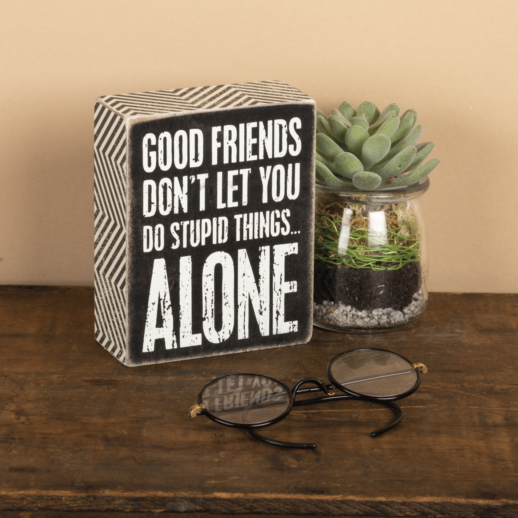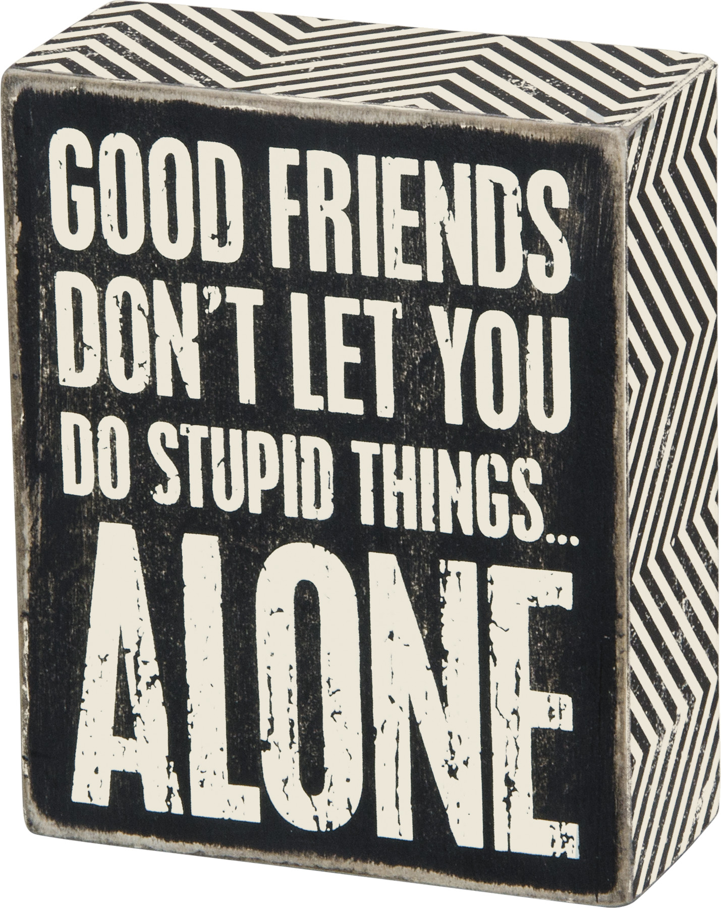 A classic black and white wooden box sign featuring a distressed "Good Friends Don't Let You Do Stupid Things⦠Alone" sentiment with zigzag trim designs. Easy to hang or can free-stand alone.