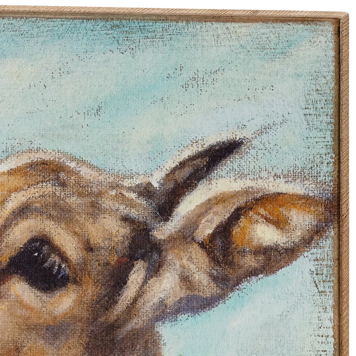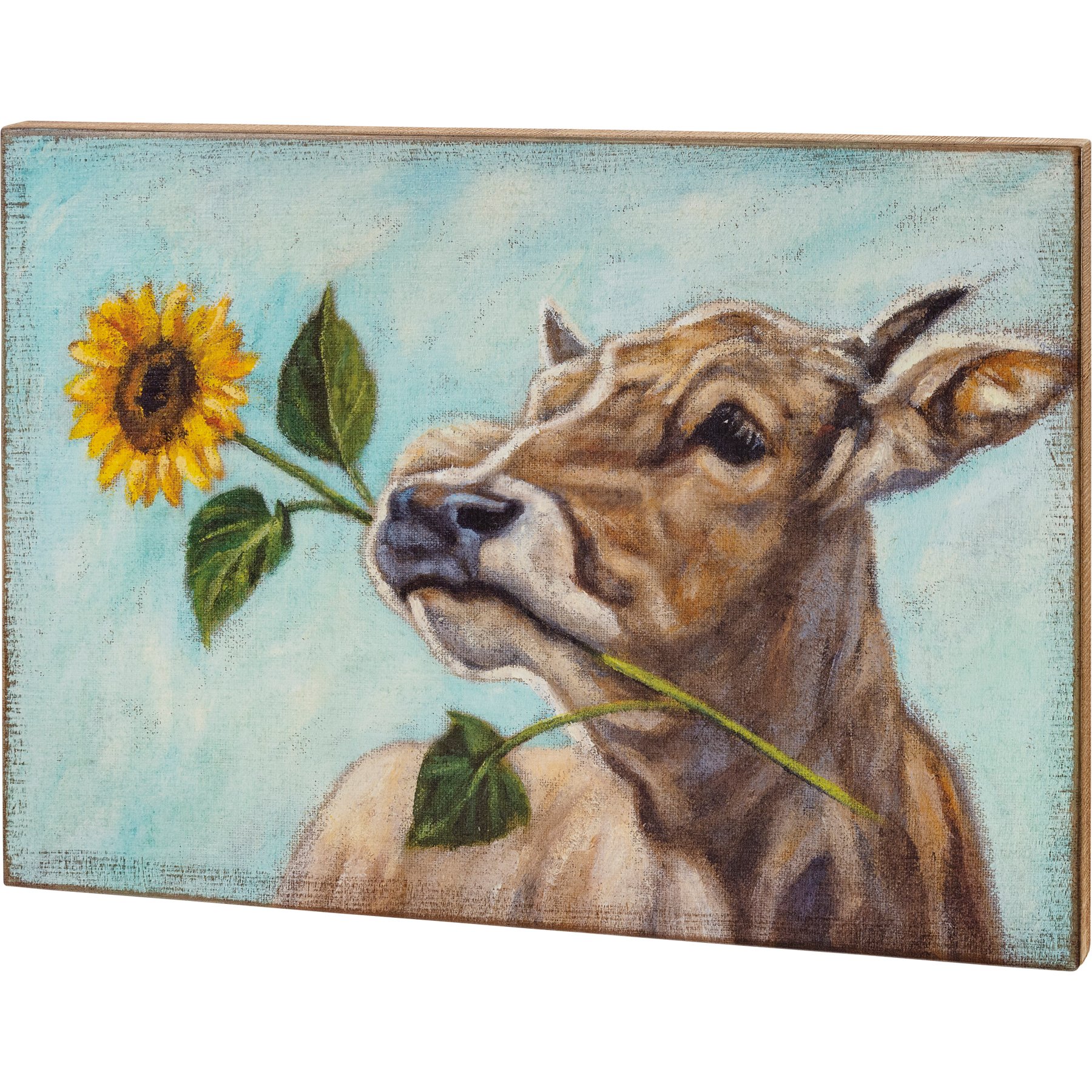 A wooden box sign featuring a cow holding a sunflower. Design is replicated from original artwork painted directly onto burlap canvas, giving a unique depth and texture to the art. The sunflower cow box sign is easy to hang or can free-stand alone.