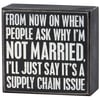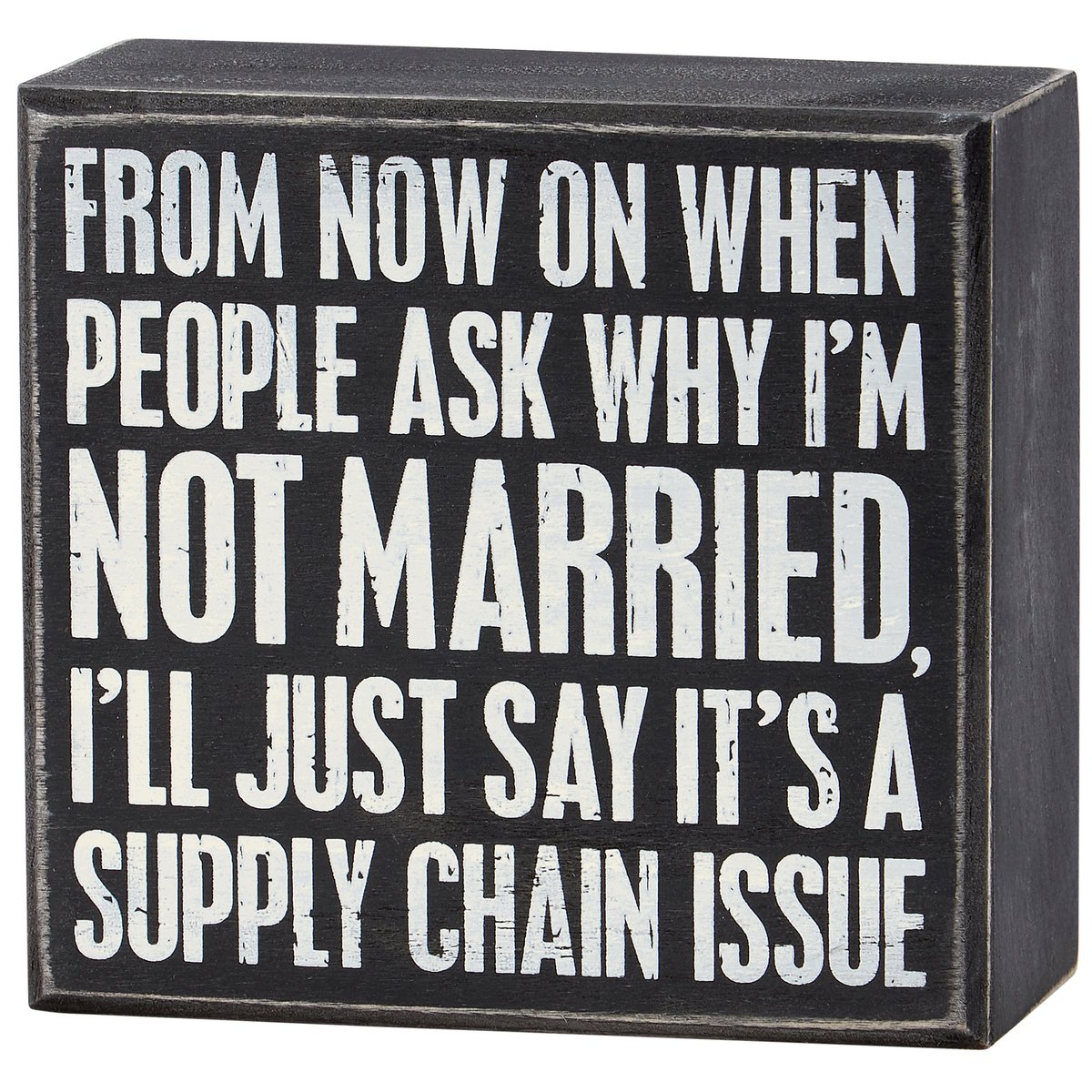 A classic black and white wooden box sign from our Box Sign Collection displaying a sassy sentiment that reads "From Now On When People Ask Why I'm Not Married, I'll Just Say It's A Supply Chain Issue." Funny box sign features distressed details with coordinating black color on sides and back. Our Supply Chain Issue box sign is easy to hang or can free-stand alone. A funny gift that can be easily displayed in any home or work space.