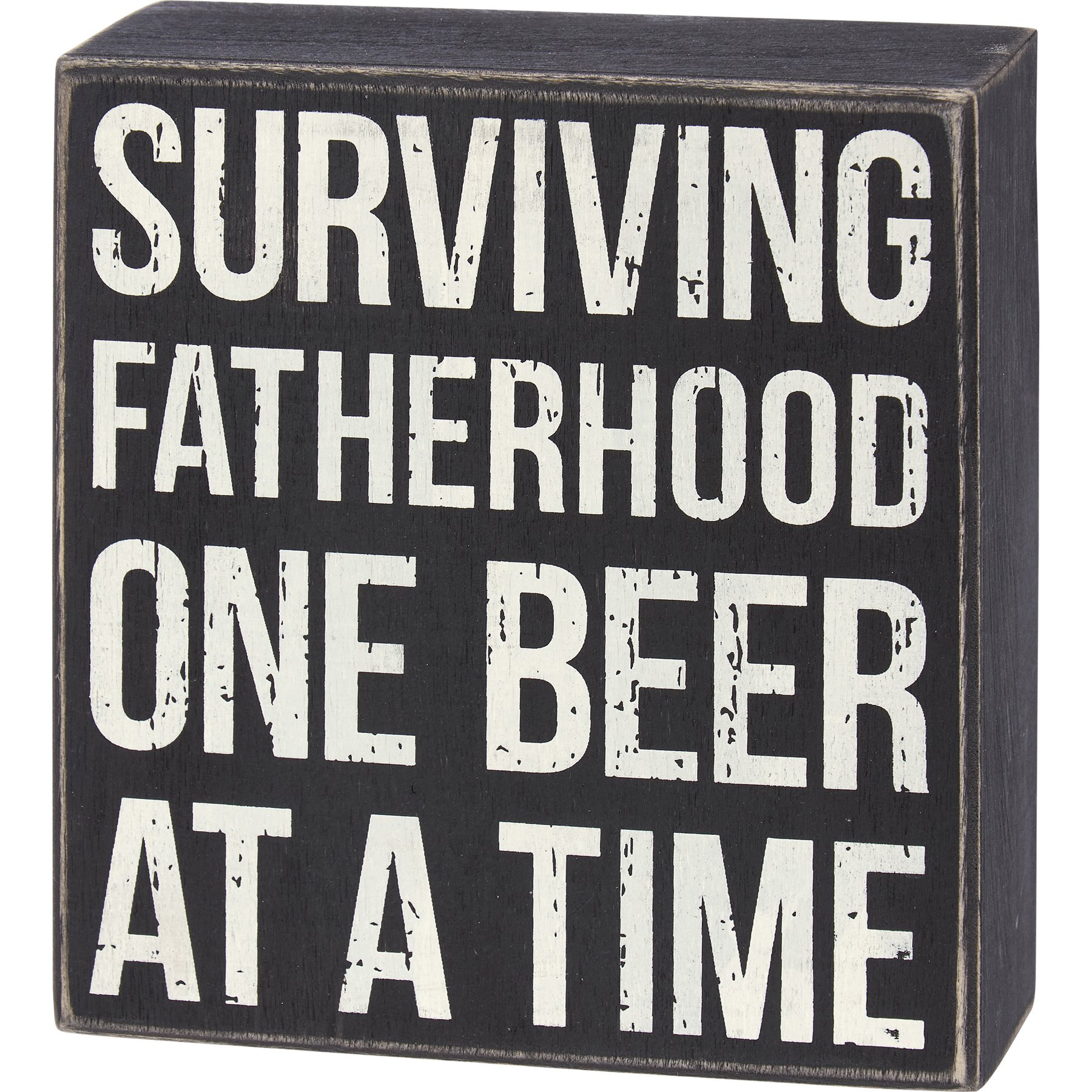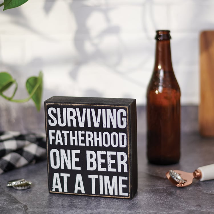 A classic black and white wooden box sign from our Father's Day Collection displaying a distressed "Surviving Fatherhood One Beer At A Time" sentiment. Our Surviving Fatherhood One Beer box sign is easy to hang or can free-stand alone.