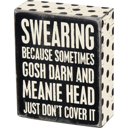 A classic black and white wooden box sign featuring a distressed "Swearing - Because Sometimes Gosh Darn And Meanie Head Just Don't Cover It" sentiment with polka dot trim designs. Easy to hang or can free-stand alone.