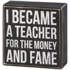 A classic black and white wooden box sign from our Teacher Collection displaying a fun teacher-themed sentiment that reads "I Became A Teacher For The Money And Fame." Teacher box sign features distressed details with coordinating black color on sides and back. Our Teacher For Fame box sign is easy to hang or can free-stand alone. A fun teacher gift that can be easily displayed in a classroom or on a desk.