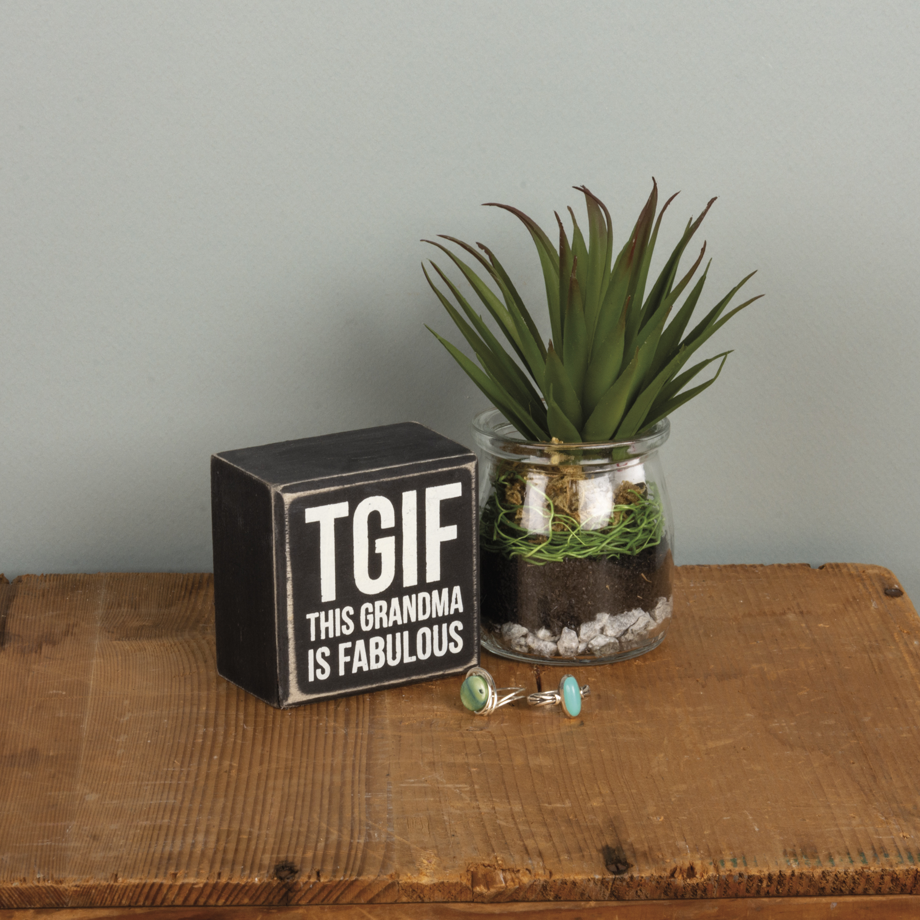 A classic black and white wooden box sign featuring a distressed "TGIF This Grandma Is Fabulous" sentiment. Easy to hang or can free-stand alone.