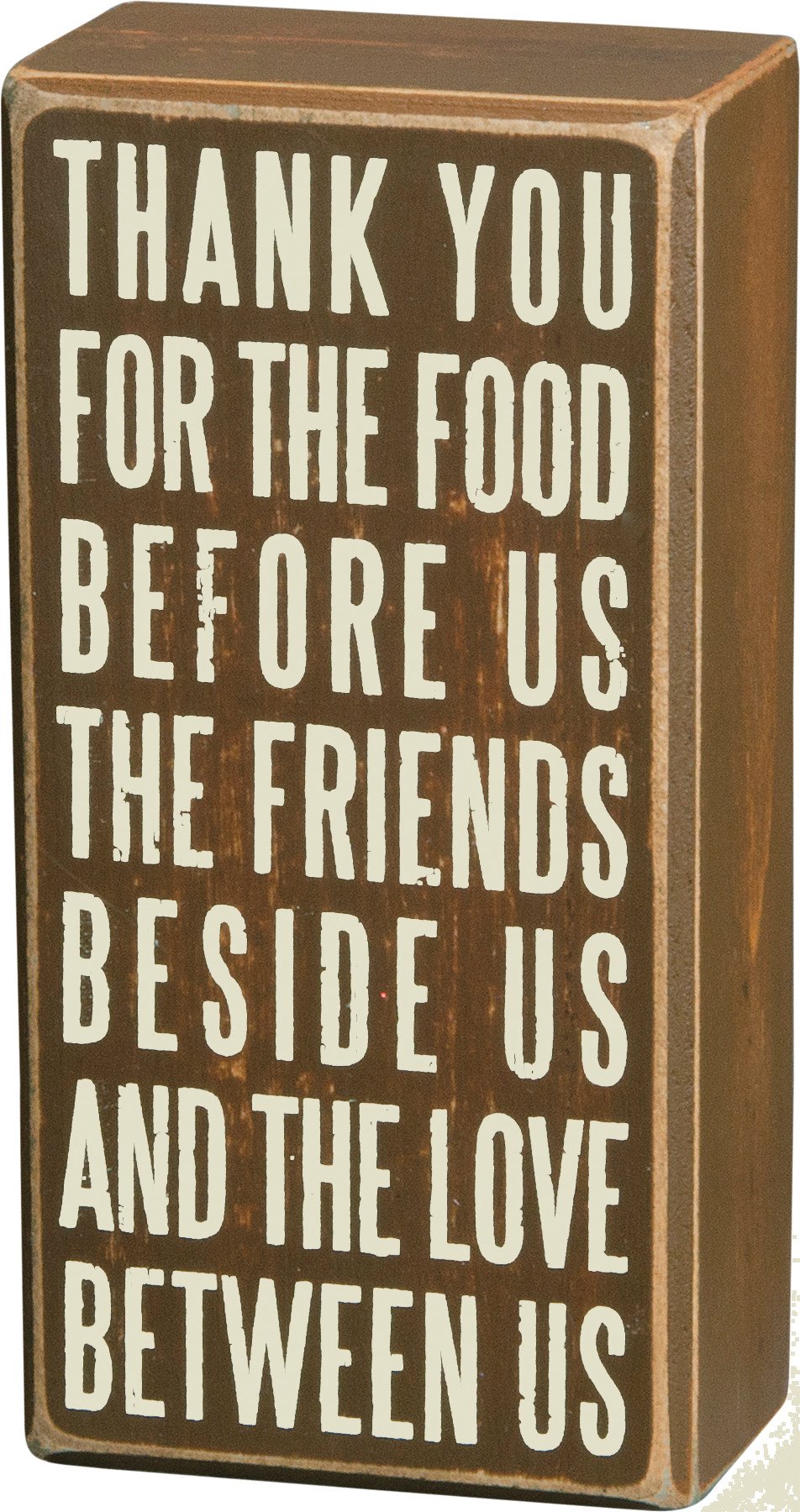 A brown and white wooden box sign featuring a distressed "Thank You For The Food Before Us - The Friends Beside Us - And The Love Between Us" sentiment that complements well with existing decor and is the perfect touch for fall! Easy to hang or can free-stand alone.