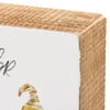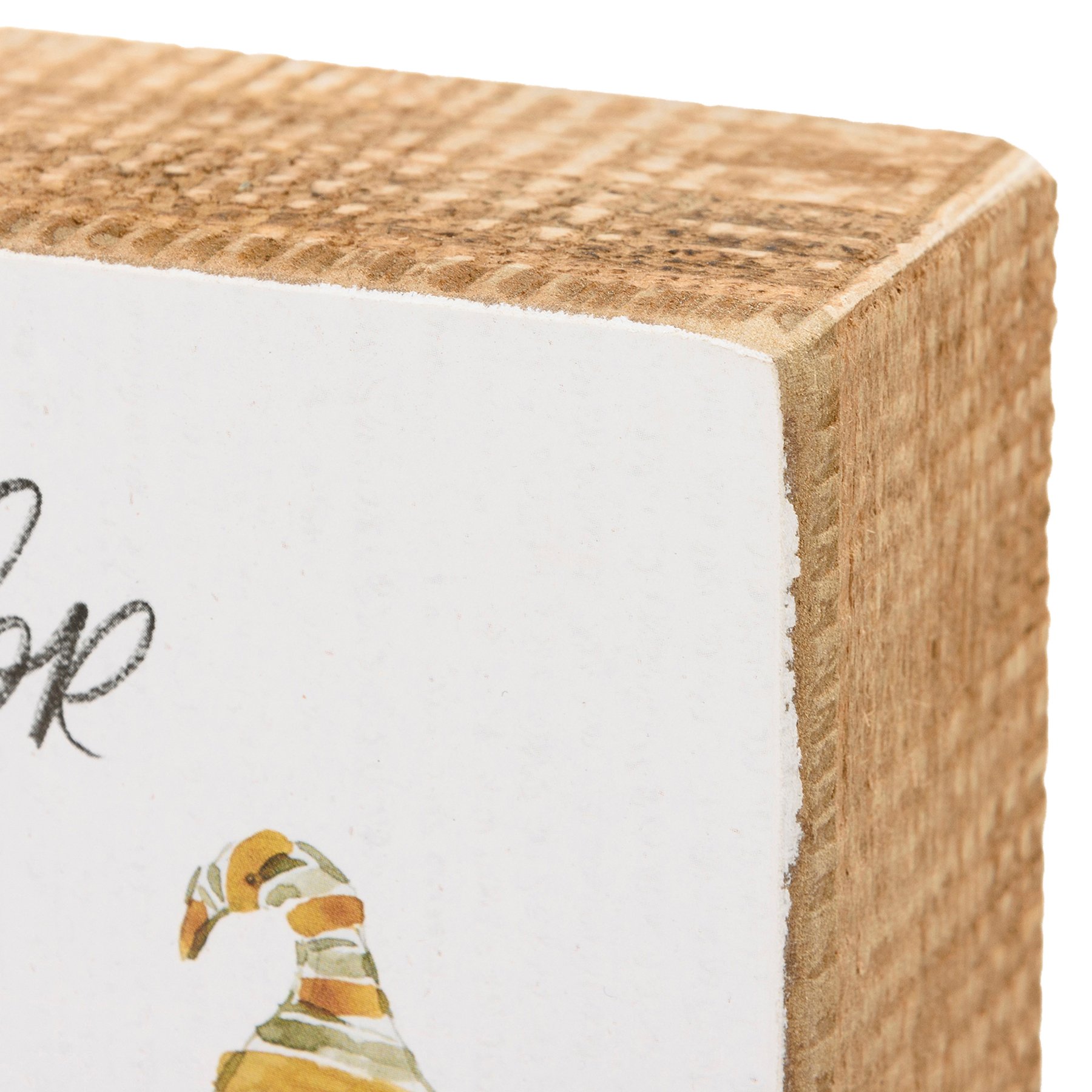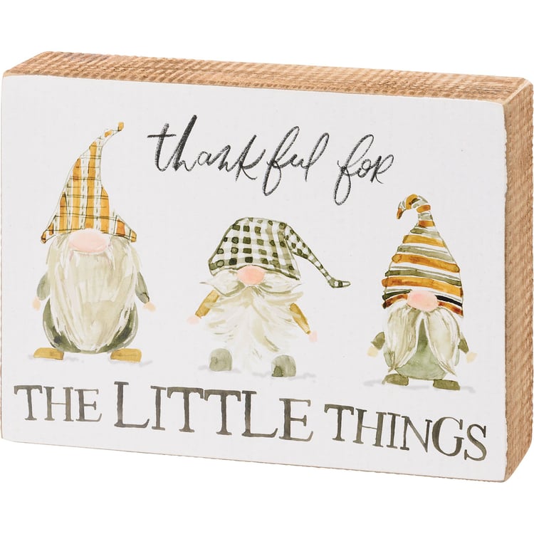 A wood sign featuring watercolor gnome art, hand lettered "Thankful For The Little Things" sentiment, and natural wood sides. Wooden wall art is easy to hang or can free-stand alone.