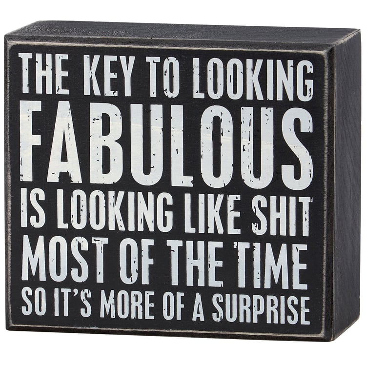 A classic black and white wooden box sign from our Box Sign Collection displaying a sassy sentiment that reads "The Key To Looking Fabulous Is Looking Like Shit Most Of The Time So It's More Of A Surprise." Funny box sign features distressed details with coordinating black color on sides and back. Our The Key To Looking Fabulous box sign is easy to hang or can free-stand alone. A funny gift that can be easily displayed in any home or work space.