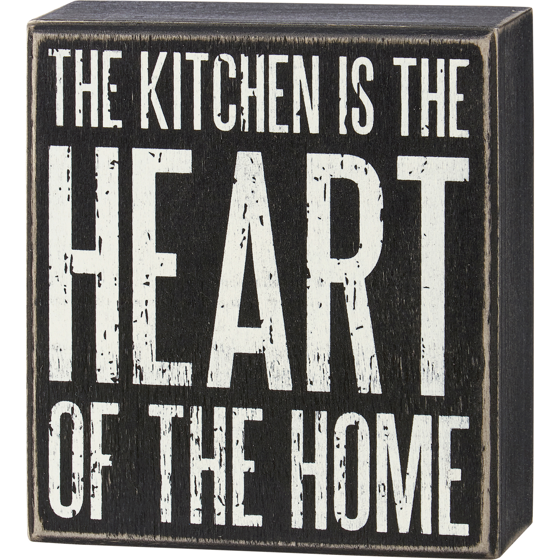 A classic black and white wooden box sign from our Room By Room Collection displaying a "The Kitchen Is The Heart Of The Home" sentiment. Box sign features distressed details with coordinating black color on sides and back. Our The Kitchen Heart Of The Home box sign is easy to hang or can free-stand alone. An everyday home accent with a variety of display options perfect for any kitchen.