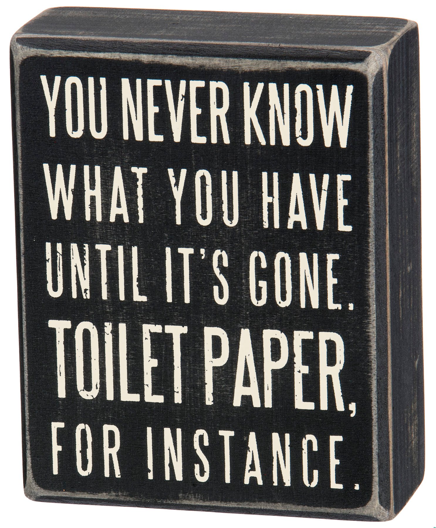 An inset box sign from our Box Sign Collection featuring a natural wood frame and inset design of a box sign style sentiment with dry brushed cream color background. Design displays humorous sentiment that reads "You Never Know What You Have Until It's Gone. Toilet Paper, For Instance" sentiment. Our Toilet Paper inset box sign is easy to hang or can free-stand alone. A fun everyday home accent with a variety of display options.