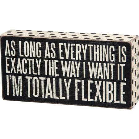 A classic black and white wooden box sign featuring a distressed "As Long As Everything Is Exactly The Way I Want It, I'm Totally Flexible" sentiment with polka dot trim designs. Easy to hang or can free-stand alone.