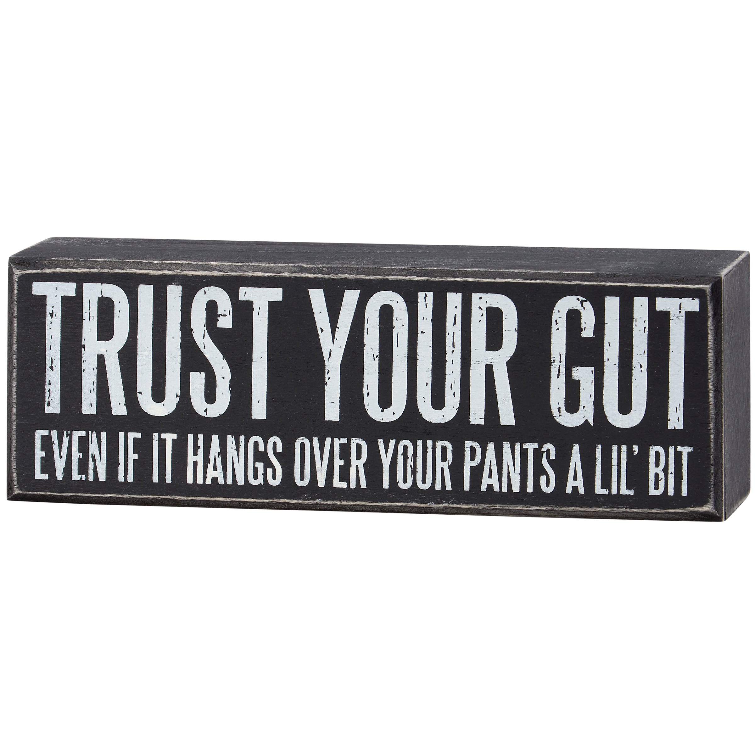 A classic black and white wooden box sign from our Box Sign Collection displaying a sassy sentiment that reads "Trust Your Gut Even If It Hangs Over Your Pants A Lil' Bit." Funny box sign features distressed details with coordinating black color on sides and back. Our Trust Your Gut box sign is easy to hang or can free-stand alone. A funny gift that can be easily displayed in any home or work space.