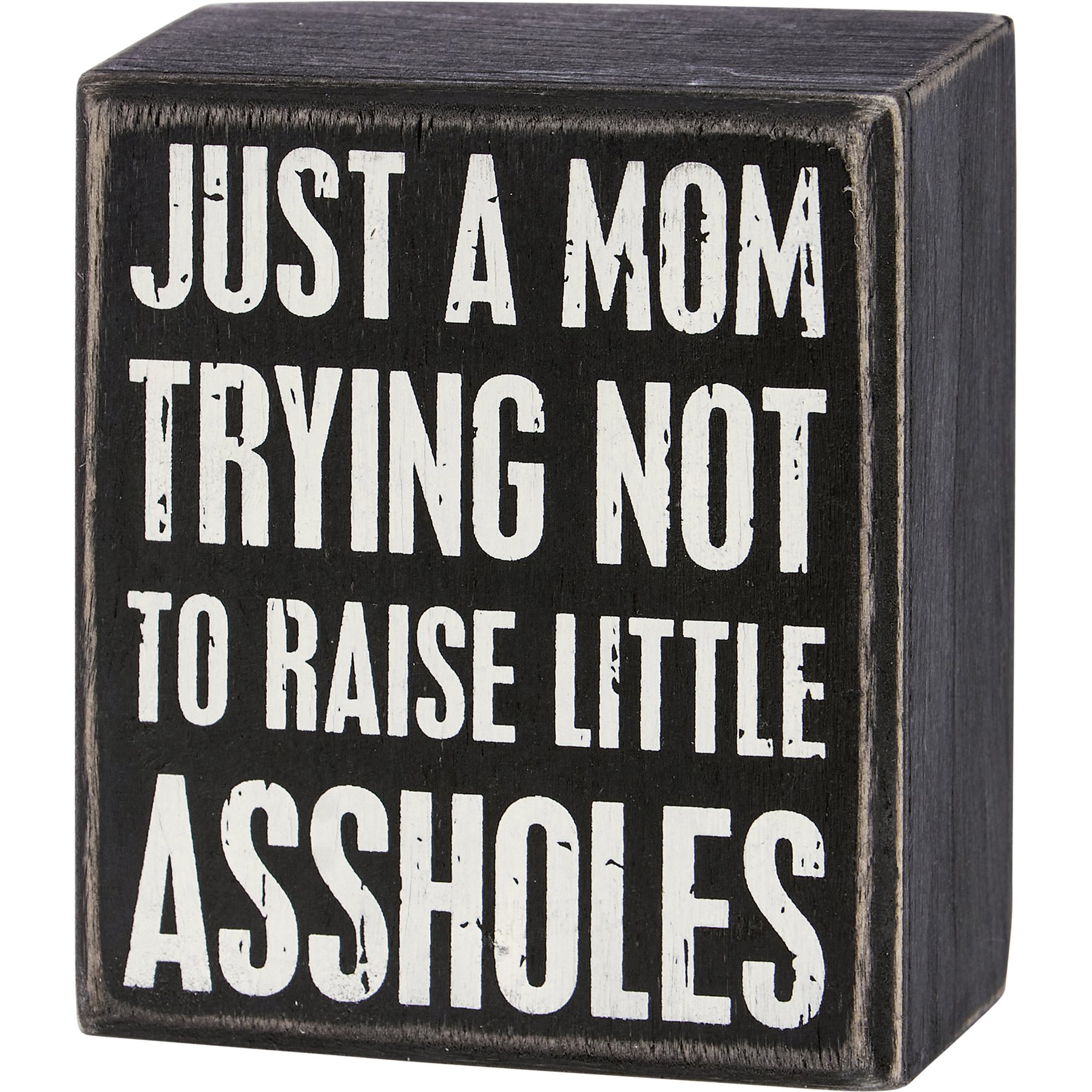 A classic black and white wooden box sign from our Mother's Day Collection displaying a distressed "Just A Mom Trying Not To Raise Little Assholes" sentiment. Our Trying Not To Raise box sign is easy to hang or can free-stand alone.