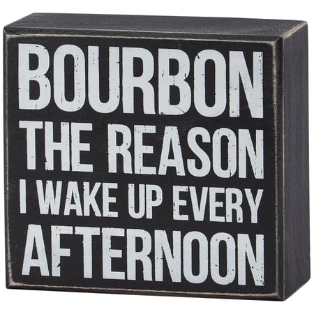 A classic black and white wooden box sign from our Box Sign Collection displaying a humorous alcohol inspired sentiment that reads "Bourbon - The Reason I Wake Up Every Afternoon." Funny box sign features distressed details with coordinating black color on sides and back. Our Wake Up Every Afternoon box sign is easy to hang or can free-stand alone. A funny alcohol-themed gift that can be easily displayed in any home or work space.
